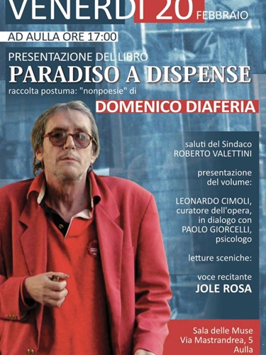 Venerdì 20 febbraio alle ore 17:00, la Sala delle Muse (Via Mastrandrea, 5) ospiterà la presentazione del libro "Paradiso a dispense", raccolta postuma di "nonpoesie" di Domenico Diaferia. L'evento, che vedrà i saluti istituzionali del Sindaco Roberto Valettini, entrerà nel vivo con un dialogo tra Leonardo Cimoli (curatore dell'opera) e lo psicologo Paolo Giorcelli. La serata sarà arricchita dalle letture sceniche a cura di Jole Rosa, che darà voce ai testi dell'autore.