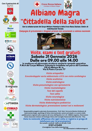 Sabato 31 Gennaio 2026, la frazione di Albiano Magra si conferma punto di riferimento per la sanità territoriale con il ritorno della "Cittadella della Salute". L'iniziativa, una campagna di prevenzione e diagnosi precoce non occasionale a valenza nazionale, è organizzata dalla Croce Rossa Italiana - Comitato di Albiano Magra in collaborazione con il Corpo Militare Volontario della Croce Rossa Italiana – Centro di mobilitazione Toscana.Dalle ore 09.00 alle 14.00, i cittadini potranno accedere a servizi sanitari gratuiti all'interno della moderna ed attrezzata struttura sanitaria campale operativa P.M.A. (Posto Medico Avanzato) del Corpo Militare Volontario, installata nel parco del Comitato CRI di Albiano Magra (Via D. Pietro Corsini 77).L'eccellenza dell'iniziativa è garantita dalla supervisione del Prof. Dott. Ferruccio Bonino, epatologo di fama internazionale e ricercatore senior presso l'Istituto di Fisiologia Clinica del CNR di Pisa, responsabile dei progetti e delle giornate di prevenzione. "La Cittadella della Salute - dichiara il sindaco Roberto Valettini - è un servizio prezioso per la cittadinanza e ringrazio la CRI di Albiano per la dedizione costante verso la salute pubblica e per la sinergia che ci permette di presidiare il territorio con efficacia."