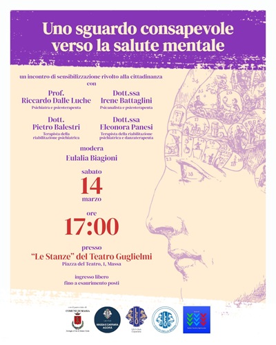 Sabato 14 marzo si terrà a Massa l'evento di sensibilizzazione "Uno sguardo consapevole verso la Salute Mentale": un'occasione di confronto pubblico, aperto alla cittadinanza, con specialisti, per parlare di dinamiche patologiche, di cura, come approcciarsi al disagio, anche giovanile e a chi rivolgersi in caso di necessità. Alle 17 presso le stanze del Teatro Guglielmi interverranno il professor Riccardo dalle Luche, psichiatra e docente presso l'Università di Firenze; la dottoressa Irene Battaglini, psicoterapeuta e fondatrice della Scuola di Psicoterapia "Erich Fromm"; la dott.ssa Eleonora Panesi, terapista della riabilitazione psichiatrica e danzaterapeuta; il dott. Pietro Balestri, terapista della riabilitazione psichiatrica e organizzatore di eventi. Conduzione di Eulalia Biagioni. Verranno affrontati temi di attualità come le peculiarità della Gen Z, le dinamiche di coppia, le dipendenze, le misure di sicurezza, la pericolosità sociale. Il pubblico presente potrà interagire con i relatori e porre direttamente domande e curiosità. Un'iniziativa patrocinata dal Comune di Massa, da un'idea dei Leo Club di Massa-Carrara, Ceparana, Golfo della Spezia. Con la collaborazione di Eventi Salute Società Spettacolo e del Lions Club Massa-Carrara. Ingresso libero fino ad esaurimento posti. Per maggiori info, scrivere a