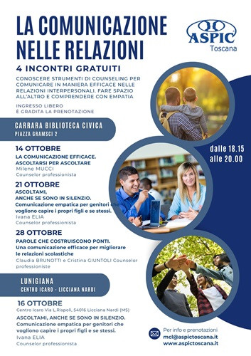 Aspic Toscana, Scuola Europea di Counseling professionale, prima scuola di Counseling nata in Italia nel 1988, torna a Carrara anche quest'anno con tre appuntamenti gratuiti e aperti a tutti per confrontarsi sui temi della comunicazione e della crescita personale . Un legame ormai consolidato da anni con la nostra provincia e con Carrara, attraverso le referenti locali della sede centrale di Firenze, e su temi che mai come in questo momento storico sono importanti come il miglioramento della qualità , umana e professionale, delle nostre relazioni .Aspic , presente sul territorio nazionale con 40 sedi che sviluppano attività ricerca, formazione e progetti di applicazione nel counseling , coaching e mediazione familiare, riconferma quindi anche quest'anno il rapporto con la Città con 3 nuovi appuntamenti a Carrara e uno in Lunigiana c/o il Centro Icaro di Licciana Nardi .Gli incontri gratuiti e aperti a tutti porteranno la riflessione sulla efficacia e l'importanza degli strumenti di counseling, quali la comunicazione assertiva e l'ascolto attivo, nelle relazioni umane in generale per arrivare poi, più specificatamente, all'ambito familiare e scolastico. Tre le date degli incontri che si svolgeranno di martedì, dalle 18 alle 20 presso la Sala Gestri della Biblioteca Comunale di Carrara in Piazza Gramsci 1 ciascuno condotto a cura di counselor professioniste di Aspic Toscana.Si inizierà a Carrara il 14 ottobre alle h 18 con " La Comunicazione Efficace . Ascoltarsi per Ascoltare " a cura di Milene Mucci per proseguire il 21 Ottobre con "Ascoltami anche se sono in silenzio. Comunicazione empatica per genitori che vogliono capire i propri figli e se stessi " a cura di Ivana Elia e il 28 Ottobre con l'incontro "Parole che costruiscono ponti .Una comunicazione efficace per migliorare le relazioni scolastiche "condotto da Cristina Giuntoli e Claudia Brunotti . Per la Lunigiana c/o il Centro Icaro di Costamala sarà ripetuto il 16 ottobre alle 18 l'incontro sulla Comunicazione empatica per genitori a cura di Ivana Elia .Gli incontri in Sala Gestri hanno avuto il Patrocinio del Comune di Carrara .Un percorso interessante ed una importante opportunità di crescita personale e professionale che Aspic con i suoi professionisti offre alla cittadinanza dedicato a chi è interessato a conoscere e migliorare le proprie modalità di essere e comunicare all'interno di relazioni sia personali che professionali oltre che un impegno importante oggi anche livello sociale nella consapevolezza che comunicare meglio e relazionarsi meglio getta sicuramente le basi per lo stare insieme in una società migliore, piu vivibile, inclusiva e coesa di cui , mai come oggi, c'è estremamente bisogno.