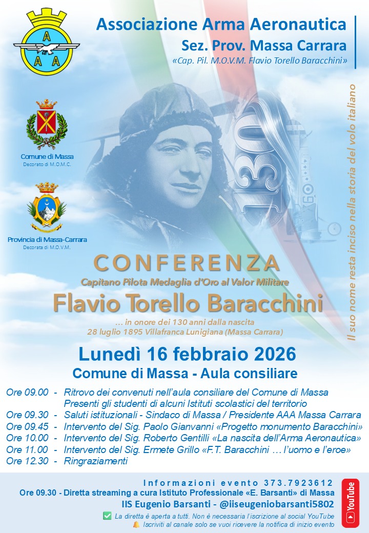 Lunedì 16 febbraio in sala consiliare 25 aprile si terrà una conferenza commemorativa per i 130anni dalla nascita del Cap. Pilota Flavio Torello Baracchini, nato il 28 luglio 1895 a Villafranca Lunigiana Decorato di Medaglia d’Oro al Valor Militare, fu tra i più celebri “assi” dell’aviazione italiana durante la Prima Guerra Mondiale. L’iniziativa, promossa dall’Associazione Arma Aeronautica – Sezione Massa-Carrara, vedrà la partecipazione di autorità civili, militari e religiose, oltre a circa 80 studenti provenienti da diversi istituti scolastici del territorio, coinvolti in un percorso culturale e formativo dedicato alla figura dell’eroe.L’intera conferenza, con interventi a tema “Progetto monumento Baracchini 130”, «La nascita dell’Arma Aeronautica» e «F. T. Baracchini… l’uomo e l’eroe», sarà trasmessa a partire dalle ore 9,30 in diretta streaming sul canale YouTube dell’istituto Eugenio Barsanti come parte del corso servizi commerciali web community. Durante la conferenza sarà illustrato l’iter progettuale per la realizzazione di un monumento dedicato all’eroe Baracchini che l’amministrazione comunale intende collocare nella via di Marina già intitolata al pilota. Il progetto prevede, nella sua prima fase, il coinvolgimento di alcuni istituti scolastici del territorio, i cui studenti saranno chiamati ad elaborare temi sulla vita del pilota e sui valori di coraggio, dedizione, servizio alla Patria e il contesto dell’Aviazione Militare. Una commissione appositamente costituita valuterà i migliori elaborati prodotti consegnandoli al liceo artistico e musicale «Felice Palma» che curerà, in collaborazione con l’IIS “Artemisia Gentileschi” di Carrara, l’esecuzione di alcuni bozzetti e la successiva realizzazione del monumento a grandezza naturale in marmo di Carrara.Il sindaco Francesco Persiani dichiara «Celebrare Flavio Torello Baracchini significa rendere omaggio non solo a un eroe della nostra Provincia, ma anche ai valori di coraggio, senso del dovere e amore per la Patria che rappresentano un esempio ancora attuale per le giovani generazioni. Il coinvolgimento delle scuole locali in questo progetto è motivo di grande orgoglio per la nostra comunità, perché unisce memoria storica, formazione e identità del territorio nel nome di un uomo e di una figura che ha dato lustro alla Provincia di Massa-Carrara e a tutta l’aviazione italiana».