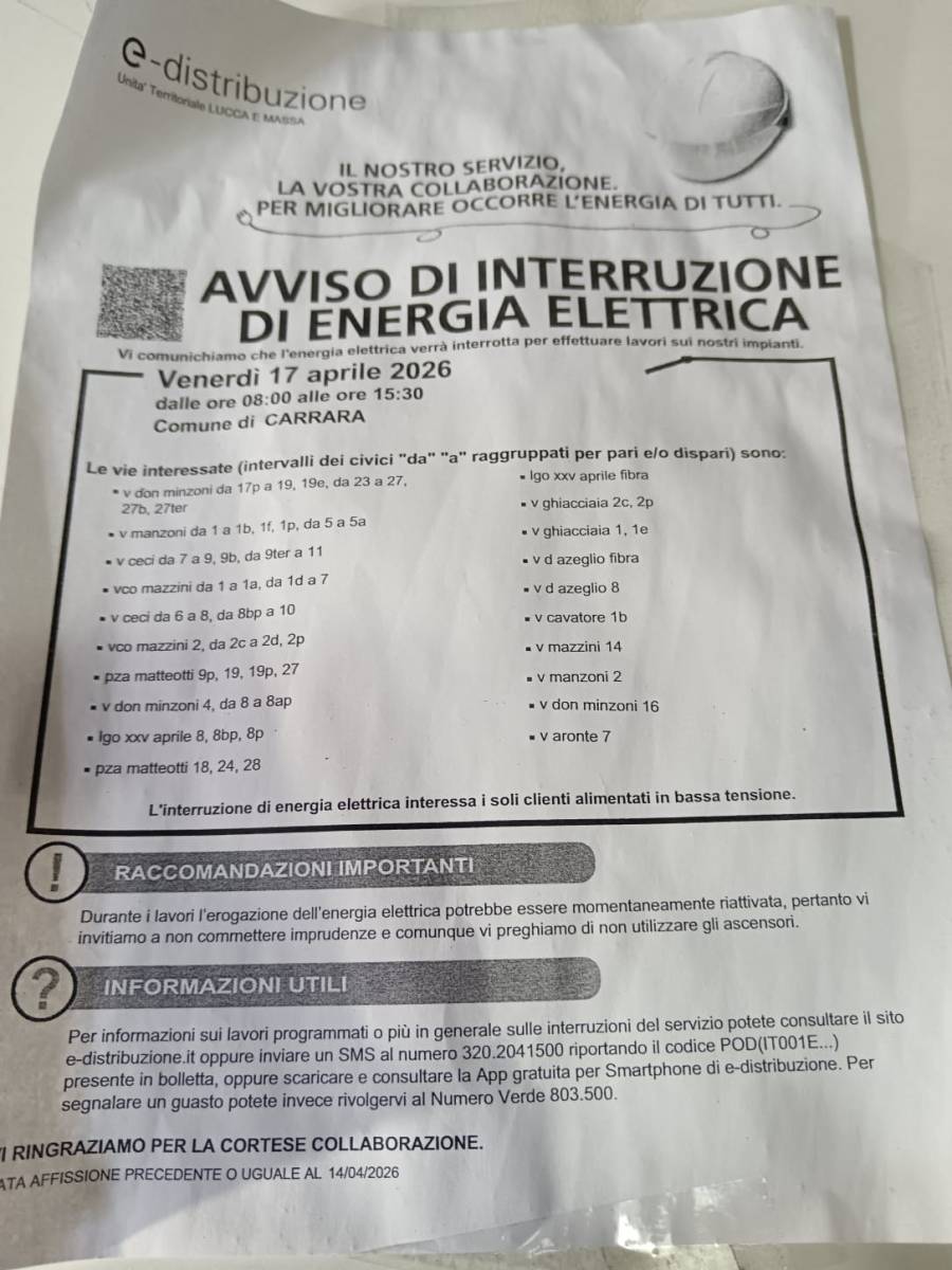 Nove ore senza corrente elettrica per quasi tutta l'area di Carrara est che si trova sulla nuova "lineagotica" dei lavori su canal Del Rio, nella giornata di venerdì 17 aprile. Tutte le attività commerciali della zona sono rimaste paralizzate: negozi di parrucchiere, lavanderie, bar, ristoranti, fotografi, che sono quelli che maggiormente necessitano della corrente elettrica, ma non meno penalizzati sono stati gli altri, visto che quasi tutti lavorano con macchine o con connessioni internet che sono saltate non avendo più il supporto della ricarica. Per non parlare dei moltissimi residenti che hanno dovuto svuotare frigoriferi e congelatori, o gettare gran parte dei loro contenuti, perchè una pausa di nove ore non consente il mantenimento della catena del freddo. L'avviso di sospensione della fornitura elettrica era stato messo da e-distribuzione, una settimana fa, ma si è rivelato impreciso nell'indicare le zone che sarebbero state coinvolte, inserendone alcune, che invece non sono state toccate dal problema - e che hanno avuto ugualmente un danno perchè i clienti non si sono presentati - e omettendone altre, che si sono ritrovate, quasi a sorpresa, in una situazione non prevista. Dal contenuto dell'avviso, peraltro, sembra non esserci connessione con la presenza, esattamente negli stessi spazi, del cantiere dei lavori di Canal Del Rio. I gestori di e-distribuzione parlano solo della "necessità di effettuare lavori sui loro impianti", che, guarda caso, però, sono proprio nella stessa sede e anche negli stessi scavi effettuati dal cantiere. E che, immaginiamo, logicamente, improrogabili e da fare proprio adesso, mentre la devastazione già causata dai cantieri, dilaga. Il volantino invita a contattare un numero whatsapp per avere informazioni, ma, ovviamente il numero (che, se chiamato, risulta inesistente) corrisponde a una chat con la quale è impossibile interagire. Abbiamo tentato, allora, di reperire informazioni sulla decisione di sospendere la corrente per un lasso di tempo così lungo, chiedendo a qualcuno del cantiere che ci ha rimandati al cartello che indica tutti i riferimenti legali dell'intervento, e che è affisso sulle transenne in via Don Minzoni. Abbiamo così scoperto non poche 'imprecisioni'. Come ditta responsabile dei lavori è indicata la Fratelli Frediani Impresa Edile Stradale, s.r.l. con sede in via Morucciola 40 a Luni, con tanto di vasto logo in alto sul cartello e l'indicazione dei contatti della ditta e del tecnico incaricato dell'impresa. Li abbiamo contattati e, sebbene - cosa tutt'altro che solita - ci abbiano prontamente risposto, ci hanno detto di non essere più loro i responsabili di quel tratto di cantiere e di essersi spostati in via Rosselli. Ovviamente non sapevano minimamente indicare chi fossero i nuovi responsabili, nè spiegare perchè il cartello non fosse stato aggiornato. Abbiamo provato, allora, con i nomi dei responsabili del comune e della sicurezza indicati sul cartello, che, peraltro, riferisce titoli sbagliati, riuscendo a parlare con il responsabile della sicurezza, che, ovviamente, si è dichiarato all'oscuro di ogni decisione riguardante il cantiere e le tempistiche di lavoro. Non siamo riusciti, invece, a parlare con l'ingegnere responsabile, perchè il numero del suo ufficio, indicato sul sito del comune, appena composto, stacca la telefonata, e il tentativo di comunicare tramite il centralino ha prodotto solo squilli a vuoto. Ma essendo ormai oltre l'ora di pranzo - sebbene il servizio dovrebbe essere attivo anche in quelle ore - è probabile che tutti fossero impegnati altrove. Non ci è rimasto che parlare con i residenti e i negozianti della zona interessata - martoriata- dai lavori e lì abbiamo trovato tanti che avevano molto da dire: stremati, inferociti per una situazione che continua a protrarsi oltre le previsioni e che sta dando il colpo di grazia alle attività commerciali, che con fatica e impegno hanno cercato di sopravvivere e di far sopravvivere questa città. Una giornata lavorativa e mezzo senza introiti per la sospensione della corrente elettrica è un importante mancato guadagno che va ad aggravare il calo drastico, che procede da mesi, dell'affluenza di clienti per una situazione similbellica, che non invoglia nessuno ad avventurarsi nelle zone in questione, sia per la difficoltà di deambulazione tra transenne e sterrati, sia per l'impossibilità di parcheggiare - se non nel parcheggio sotterraneo della Montecatini che deve anche servire tutti i residenti- sia per il sistematico quarto d'ora - quando va bene- necessario per entrare e per poi uscire da Carrara centro, a causa delle strade chiuse per i cantieri. Alcuni hanno anche fatto notare come, nonostante l'infinito disagio causato e l'insofferenza crescente, non ci siano segni di vera premura nell'accelerare al massimo i lavori: "I cantieri non lavorano nei weekend, nè di notte, nè con la pioggia. Si poteva prevedere una struttura con un tendone di copertura che facesse lavorare in ogni condizione atmosferica" ha detto un commerciante. "La situazione è insostenibile, non si può andare avanti così" hanno detto altri, mentre si delinea la possibilità di creare un fronte comune per affrontare, anche giuridicamente, la situazione. I commercianti si sono dichiarati basiti per il fatto che, in questo progetto che si sapeva così invasivo per la città e duraturo, non sia stato previsto alcun ristoro per le attività commerciali.