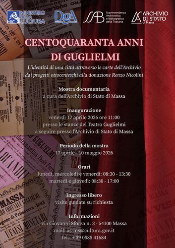 In occasione delle celebrazioni per il centoquarantesimo anniversario del Teatro Guglielmi, venerdì 17 aprile 2026 è stata inaugurata presso le Stanze del Teatro Guglielmi e, a seguire, all’ Archivio di Stato di Massa, si terrà l’inaugurazione della mostra "140 Anni di Guglielmi ". L’esposizione è il frutto di una stretta collaborazione tra l’Archivio di Stato di Massa, il Comune di Massa, la Deputazione di Storia Patria per le Antiche Provincie Modenesi (sez. Massa e Carrara) e la Biblioteca Civica S. Giampaoli. Un percorso che attraversa un secolo e mezzo di storia, cultura e vita civile della città di Massa e del suo territorio, ricostruito grazie alla valorizzazione delle testimonianze documentarie dell'Archivio Storico del Comune di Massa e alla presentazione di una selezione di immagini, fotografie e locandine provenienti dalla Donazione Renzo Nicolini, recentemente acquisita dall'Archivio di Stato. La mostra svela i retroscena della nascita del Guglielmi, esponendo documenti che illustrano le origini del nome, la partecipazione cittadina con il Registro delle sottoscrizioni, le lettere dell’architetto Micheli e perizie dei tecnici comunali, ma non mancano anche le fotografie dei primi del Novecento.
