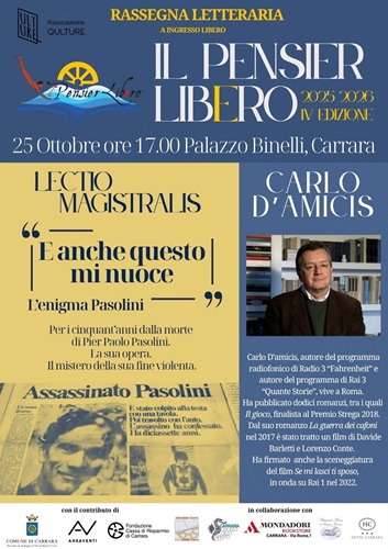 Sabato 25 ottobre, a Carrara, si terrà un importante evento culturale organizzato dall’Associazione Qulture nell’ambito della rassegna Il Pensier Lib(e)ro. Alle ore 17.00, presso Palazzo Binelli, lo scrittore e intellettuale Carlo D’Amicis terrà una conferenza intitolata: “E anche questo mi nuoce”, dedicata a Pier Paolo Pasolini del quale, proprio quest’anno, ricorre il cinquantenario dalla violenta e tuttora enigmatica morte. Si sa che del suo omicidio, infatti, avvenuto al Lido di Ostia nella notte tra l’1 e il 2 novembre 1975 si autoaccusò, per poi ritrattare – con una serie di contraddizioni che coinvolsero alcuni ambienti malavitosi neofascisti – il “ragazzo di vita” Pino Pelosi.