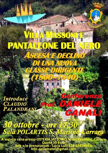 L’Associazione APUAMATER ha promosso un ciclo di incontri teso a far meglio conoscere a cittadini ed amministratori, la storia ed il valore che la Villa della Rocca, più nota come Villa Massoni, riveste per la città di Massa e - più in generale - per il comprensorio apuano. In questo quadro, alcuni accreditati studiosi locali, si sono cortesemente resi disponibili a sviluppare aspetti architettonici riguardanti lo storico edificio, e biografici, relativi ai protagonisti che - in tempi diversi - ne hanno segnato le fasi di ampliamento e di progressivo abbellimento. Il professor Daniele Canali, storico e saggista, autore di numerosi e noti lavori di ricerca riguardanti l’evoluzione della società borghese nel nostro territorio, si è reso disponibile a trattare il tema: "Villa Massoni e Pantaleone Del Nero. Ascesa e declino di una nuova classe dirigente (1800-1840)". La conferenza pubblica, che si terrà giovedì 30 Ottobre alle17,30 nella Sala del Centro Polartis a San Martino – Carrara, sarà introdotta dal presidente dell’Ass. Apuamater. Amm. Enzo Menconi e dall’Architetto Claudio Palandrani. L’argomento che sarà oggetto della conferenza riguarda una delle figure di maggiore rilievo nella storia carrarese della prima metà dell’Ottocento: Pantaleone Del Nero, un facoltoso personaggio legato agli ambienti del marmo, che acquista la Villa della Polletta, già appartenuta al conte svedese Adolf Fredrick Munck. Il periodo del quale parlerà il professor Canali (1800-1840) è di sicuro interesse storico, perché va dalla fase pre-napoleonica fino all’arrivo degli estensi. È questa la fase storica che comporterà la perdita dell’autonomia statuale per Massa e Carrara e il loro ingresso, come provincia, nel Ducato di Modena. È però anche la fase che anticipa la nascita di una nuova borghesia del marmo, nel complesso periodo che precede la rivoluzione industriale della metà del secolo e l’Unità Nazionale. Il relatore, che ben conosce Pantaleone Del Nero ed il mondo della borghesia apuana di quel periodo ricco di fermenti sociali e di rivolgimenti politici ed economici, saprà certamente affascinare il pubblico con la sua nota facondia.