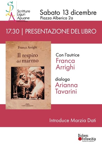 Sabato 13 dicembre presso la Dickens Fellowship in Piazza Alberica 2/a nuovo appuntamento con le Scritture Liguri Apuane, una rassegna letteraria ideata dalla filiale italiana della Dickens Fellowship con l’intento di dare voce a scrittori dell’area geografica che si estende dalla Versilia, La Spezia e Lunigiana. Sarà Franca Arrighi, scrittrice di Carrara, a presentare il suo ultimo romanzo Il respiro del Marmo (Carte Amaranto, 2025). Introdurrà il pomeriggio Marzia Dati, dialogherà con la scrittrice Arianna Tavarini.“Siamo molto felici di presentare Il respiro del Marmo – dichiara Marzia Dati – e in particolare di promuovere una scrittrice di Carrara il cui romanzo è un tributo autentico alla città del marmo”.