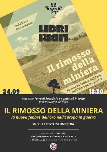 Si terrà venerdì 24 ottobre, alle 18.30 il secondo appuntamento della rassegna sull'estrattivismo "Terre Fuori Luogo", al circolo Arci Fuori Luogo a Carrara. Un appuntamento al mese per raccontare, attraverso libri, documentari e altre espressioni culturali, i territori in Italia e nel mondo dove attività economiche e produttive determinano la vita o la morte delle loro comunità. Il Collettivo Escombrera di Torino presenterà il libro “IL RIMOSSO DELLA MINIERA la nuova febbre dell'oro nell'Europa in guerra”, frutto di un insieme di incontri, interviste, assemblee, discussioni, autoformazioni e proposte di chi si oppone ai sempre crescenti progetti minerari in Europa e anche nelle montagne italiane. Questa nuova ondata estrattiva, dovuta all'aumento della domanda di prodotti minerari per alimentare i progetti energetici, bellici e di intelligenza artificiale, richiede uno sguardo oltre il locale, che abbracci il contesto europeo e globale.