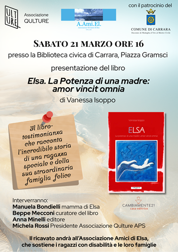 Sabato 21 marzo, alle ore 16,00 presso la Sala Gestri della Biblioteca comunale di Carrara, sarà presentato il libro “Elsa. La potenza di una madre. Amor vincit omnia”, della scrittrice romana Vanessa Isoppo. Un libro che racconta la storia di Elsa, affetta da una malattia rara, di quelle in grado di rubarti il futuro prima ancora di iniziarlo. Il cammino di Elsa, nata senza mielina, inizialmente è incerto, ma grazie alla tenacia dei genitori, il cui scopo diventa regalare ogni giorno spicchi di autonomia alla loro bambina, prende una direzione sempre più definita verso una vita fatta di progressi, supporto e condivisione. Non ha eguali la forza di Elsa, la cui storia ha sbalordito molti medici. Una storia che scardina le nostre certezze e che dimostra come davvero “amor vincit omnia”. Perché il vero successo di un genitore è crescere figli felici e, in questo senso, la storia di Elsa è la storia di un trionfo. Le vicende di una famiglia felice che a un certo punto si arricchisce anche di un nuovo membro, un bambino con disabilità che viene adottato con gioia da questi fantastici genitori. Senza contare gli amici che li circondano e che, sempre più numerosi, contribuiscono alla nascita dell’associazione A.Ami.El. (Amici di Elsa).