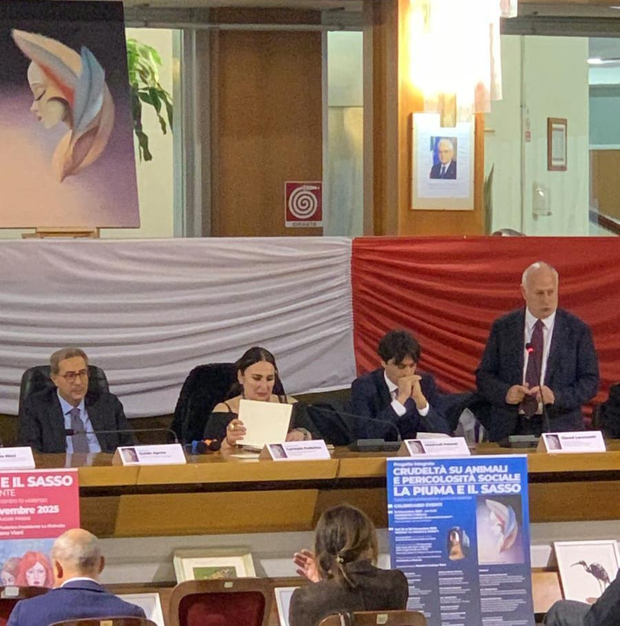 C’era un silenzio particolare, nella mattinata di venerdì 14 novembre, nelle sala consiliare del comune di Massa. Un silenzio pieno di attesa, di curiosità, di qualcosa che stava per accadere. I corridoi erano animati da studenti che parlavano sottovoce, da docenti che accompagnavano le classi, da occhi attenti pronti ad ascoltare. E in quell’atmosfera sospesa, il Progetto “Crudeltà su Animali e Pericolosità Sociale – La Piuma e il Sasso”, ideato e promosso dall’avvocato Carmela Federico presidente da La Rivincita, ha preso forma con l’intensità delle cose che contano davvero. Non è stata una semplice lezione: è stata una chiamata alla responsabilità. Il fulcro era il fenomeno del LINK — la correlazione tra maltrattamento animale e pericolosità sociale — e quel messaggio è arrivato chiaro, forte, diretto ai giovani seduti in platea. Al centro del dibattito si sono collocate le relatrici di LINK Italia, le cui voci hanno trasformato teorie complesse in strumenti concreti per ragazzi e insegnanti: dottoressa Francesca Sorcinelli (pedagogista ed educatrice professionale socio pedagocica. Presidente AssociazioneLINK -ITALIA THE LINK - Implicazioni sociali delle condotte in danno ad animali) ha posto l’accento sull’aspetto educativo: ha spiegato come riconoscere segnali di disagio nei coetanei e nell’ambiente famigliare, come trasformare l’empatia in azione quotidiana e come la scuola possa essere luogo di prevenzione. Il suo intervento ha dato ai ragazzi chiavi pratiche per comprendere il valore della cura e della parola come primo antidoto alla violenza. Avvocato Claudia Ricci (Responsabile Ufficio Legale Nazionale ENPA ODV) ha fatto luce sugli aspetti normativi: in modo accessibile, ha descritto quali sono le tutele previste dalla legge per gli animali, le possibili conseguenze penali del maltrattamento e i percorsi di denuncia e tutela. Per gli studenti, è stato un vero incontro con i diritti: capire che esistono norme che proteggono gli esseri indifesi dà forza all’azione civile. La dottoressa Michela Bosi (Ispettore della Polizia Locale comune di Crevalcore, Coordinatrice Associazione Volunteers Vs Violence) ha portato sul palco la concretezza dell’intervento operativo: ha raccontato come si attiva una segnalazione, quali sono gli strumenti di controllo e prevenzione sul territorio e quali canali utilizzare per chiedere aiuto. Il suo racconto ha trasformato l’astratto in pratico: i ragazzi hanno imparato quando e come rivolgersi alle forze dell’ordine o alle associazioni, senza paura e senza reticenze. Questi interventi — integrati da riflessioni di altri esperti e professionisti, come il dottor Marco Melosi, Presidente ANMVI (associazione nazionale medici veterinari) presenti — non si sono limitati alla teoria: hanno offerto strumenti pratici e linguaggi comprensibili ai giovani, invitandoli a diventare attori consapevoli nella propria comunità. Il filo rosso è stato chiaro: informarsi significa non restare spettatori. Uno dopo l’altro, i rappresentanti dello Stato hanno preso la parola - presente anche la dottoressa Bianca Venezia, Questore di Massa Carrara - ma quel giorno, nei loro interventi, c’era qualcosa di diverso: un tono più umano, più diretto, più vicino ai ragazzi seduti davanti a loro. Il Prefetto Guido Aprea, ha aperto con riflessioni che sono sembrate un invito: “Non abbiate paura di vedere e di capire”, ha detto. E la sala ha ascoltato in un silenzio carico di responsabilità. E poi le parole bellissime del Presidente del Consiglio Comunale di Massa, Agostino Incoronato: un saluto istituzionale che è diventato un messaggio profondo, quasi paterno, rivolto ai ragazzi e al loro ruolo nella comunità. Momento di forza pura è stato l’intervento del Senatore Manfred Potenti. La sua energia, la sua passione, la sua esperienza nella Commissione Giustizia, nella Bicamerale Antimafia e nella qualità di responsabile nazionale del dipartimento tutela e benessere animali, hanno dato peso e prospettiva alla discussione. Ha parlato del LINK come di un fenomeno che lo Stato deve affrontare con lucidità e determinazione, ma anche con una rete sociale forte. Le sue parole hanno acceso la sala.