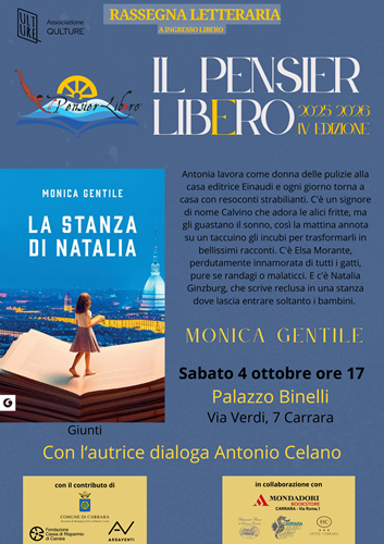 “Gli adulti non rispondevano alle domande cruciali: loro vivevano in una zona impervia oltre il filo spinato, io ero confinata in un territorio in definizione. Non potevo capirli”. Ecco solo uno dei temi, il rapporto tra adulti e preadolescenti, contenuti nel bel romanzo di formazione “La stanza di Natalia” di Monica Gentile (Giunti). Il libro, inserito nella rassegna “Il Pensier lib(e)ro”, organizzata dall’Associazione Qulture sotto la direzione artistica di Antonio Celano, sarà presentato il 4 ottobre presso la sala conferenze di Palazzo Binelli a Carrara, alle ore 17. Un romanzo ricco di spunti interessanti: dalla famiglia disfunzionale ai riti di passaggio all’età adulta, dagli ambienti degli emigrati meridionali al nord alla Torino einaudiana dei primi anni Ottanta ecc.Isabella, la voce narrante, ha dieci anni quando la madre abbandona la famiglia e il padre, inadeguato, decide di mandarla dai nonni a Torino. È l’estate del 1981, e Isabella lascia la sua Agrigento per il nord. A Torino la aspettano lo zio Alfredo, di cui è da sempre un po’ innamorata, il nonno Pacifico e soprattutto Antonia, la nonna generosa e immodesta, geniale e bugiarda, che ha il dono speciale di inventare storie per alleviare il peso di un’esistenza faticosa. Antonia lavora, tra l’altro, come donna delle pulizie alla casa editrice Einaudi e ogni giorno torna a casa con resoconti strabilianti in cui appaiono come lampi Calvino e le sue alici fritte o Elsa Morante, innamorata di tutti i gatti. E c’è Natalia Ginzburg, che scrive reclusa in una stanza dove lascia entrare soltanto i bambini come Isabella, sempre offesa dall’indifferenza degli adulti. Un giorno, spinta dalla sua innata disposizione a mettersi nei guai, la protagonista compie un gesto di ribellione folle e sorprendente che, però, la porterà a fare pace con sé stessa e forse con il mondo dei grandi.
