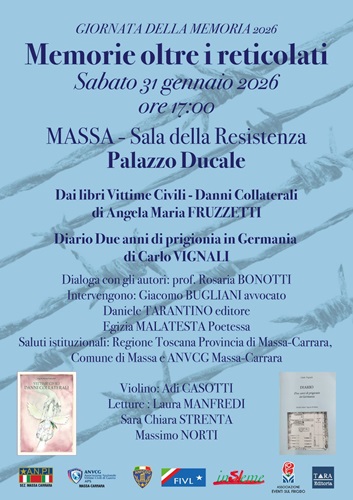 In occasione della Giornata della memoria 2026 sabato 31 gennaio alle ore 17 nella Sala della Resistenza di Palazzo Ducale si terrà un incontro culturale che vede la presentazione di due volumi che trattano l’argomento della deportazione di civili e militari.“Memorie oltre i reticolati” vuole essere una denuncia verso il sistema nazifascista che condannò ai campi di concentramento milioni di persone, vittime civili e militari, persone ritenute inferiori. Una memoria raccontata da chi sopravvisse a quegli orrori nei libri “Vittime civili Danni collaterali” di Angela Maria Fruzzetti e “Diario Due anni di prigionia in Germania” di Carlo Vignali. Nel primo libro, edito da Tara Editoria su progetto dell’Anvcg di Massa Carrara, la scrittrice riporta testimonianze di alcuni reduci sopravvissuti alle deportazioni: Domenico Fruzzetti, Arturo Lazzaro Stagnari, Giovanni Fruzzetti, Adelmo Mosti per “un ritorno che mai è stato un ritorno”. Il libro di Vignali riporta le pagine del diario del padre, soldato Mario, internato per due anni nei campi nazisti.Presenterà gli autori la professoressa Rosaria Bonotti, che entrerà nel vivo delle narrazioni con domande e riflessioni. Introducono Giacomo Bugliani, ex consigliere regionale, e Daniele Tarantino editore di Tara Editoria. Porteranno il saluto il consigliere regionale, Gianni Lorenzetti, la provincia di Massa Carrara con il vice presidente Alfredo Camera, il Comune di Massa e ANVCG con Grazia Ugliarolo. Le letture sono affidate a Laura Manfredi, Massimo Norti e Sara Chiara Strenta. La poetessa Egizia Malatesta declamerà una poesia dedicata al padre. Protagonista d’eccezione la violinista Adi Casotti che accompagnerà l’evento con il suo struggente violino proponendo brani a tema. L’invito a partecipare è rivolto alla popolazione. L’incontro ha il patrocinio della Provincia di Massa Carrara e delle associazioni Insieme, Anpi, Anvcg, Anfcdg, Fivl, Eventi sul Frigido, Insieme e Tara Editoria. L’appuntamento è promosso dall’associazione culturale Insieme nell’ambito del progetto “Cultura in tour”.