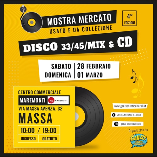 Ad invitarvi in questo viaggio musicale, saranno espositori selezionati provenienti da tutta Italia, presenti alla Mostra Mercato del Disco di Massa con una vastissima offerta di vinili (33 e 45 giri), CD, Mix per DJ e rarità, spaziando dai grandi classici del rock alla disco music, dal jazz alle colonne sonore cinematografiche, dal blues al metal.Anche per la sua quarta edizione, la Mostra Mercato del Disco di Massa si svolgerà negli spazi del Centro Commerciale MareMonti, location centrale e facilmente raggiungibile, che garantisce un’accoglienza ottimale per i visitatori, grazie ai numerosi servizi e alla facilità di parcheggio, in un perfetto connubio tra shopping e tempo libero.L’organizzazione dell’evento è affidata a Ganzo! Eventi Culturali, realtà leader nel settore delle Mostre Mercato del Disco in tutta Italia, capaci di attirare sia il collezionista professionista in cerca del pezzo pregiato, sia il giovane appassionato che si avvicina per la prima volta al mondo del vinile e dei supporti analogici.Per tutti gli appassionati musicali che vogliono concedersi del tempo di qualità per andare a caccia di dischi, CD e Mix, la 4ª Mostra Mercato del Disco di Massa sarà aperta sabato 28 febbraio e domenica 1° marzo, con orario continuato dalle 10:00 alle 19:00, al Centro Commerciale MareMonti di Massa, con ingresso libero e gratuito.