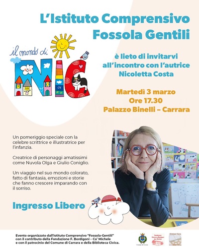 L'incontro con l'autrice Nicoletta Costa e il suo "Mondo di Nic" è nato da un'idea dell'insegnante Laura Biggi proposto ed approvato al collegio dei docenti ed è stato fortemente sostenuto anche da Giovanna Amodio, nuova dirigente dell'istituto. Importante anche il supporto dell'associazione Ca' Michele di Bonascola. "Nelle classi interessate c'è gran fermento - ha dichiarato Laura Biggi - i bambini più grandi che leggono per i più piccoli, occhi ed orecchie attenti, mani e colori che scorrono veloci sui fogli, ed ecco che i vari personaggi prendono forma e vita. Si preparano cartelloni e striscioni di benvenuto per questa ospite tanto amata ed attesa da adulti e bambini. Non si è mai troppo grandi, troppo impegnati o troppo stanchi per rinunciare ad una bella storia e ad un momento di gioiosa condivisione culturale". Nicoletta Costa sarà protagonista anche di un incontro pubblico per la presentazione del suo libro "Il mondo di Nic " che si terrà a Palazzo Binelli martedì 3 marzo alle ore 17.30.