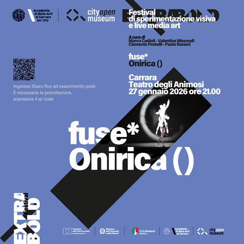 Il Festival di sperimentazione visiva e live media art EXTRABOLD presenta il suo terzo appuntamento con Onirica ( ), progetto live media del collettivo internazionale fuse*, in scena il 27 gennaio 2026 alle ore 21.00 al Teatro degli Animosi di Carrara. EXTRABOLD è un festival a ingresso gratuito che propone cinque serate live tra dicembre 2025 e marzo 2026, con la partecipazione di artisti di rilievo internazionale come SPIME.IM, Alva Noto, fuse* e Lorem. Il festival è ideato e curato dai docenti dell’Accademia di Belle Arti di Carrara Marco Cadioli, Valentina Miorandi, Clemente Pestelli e Paolo Ranieri, ed è dedicato alla sperimentazione visiva e alla live media art. Il progetto si inserisce nello spirito di C.O.M.: com.unità dell’arte diffusa, dialogando con una visione dell’arte come spazio aperto, condiviso e in continua trasformazione. L’acronimo C.O.M. (City Open Museum) sintetizza il progetto di arte diffusa, transmediale, multimodale e interattiva promosso dall’Accademia di Belle Arti di Carrara. C.O.M. si configura come un museo a cielo aperto e come un luogo mentale che attraversa e supera la tradizionale distribuzione topografica dell’arte tra città, piazze e parchi, ampliandone il raggio d’azione. Da questa prospettiva nasce un sistema a cerchi concentrici che mette in relazione Conservatori, Accademie e Università, generando comunità temporanee capaci di condividere esperienze e differenze, mantenendo viva l’identità dei territori coinvolti. Una grande comunità (con)temporanea che, come sottolinea Angelo Capasso, direttore artistico di C.O.M., interpreta la vocazione dell’arte a vivere oltre confini rigidi.In questo contesto, fuse*, studio d’arte multidisciplinare attivo nella ricerca sulle tecnologie emergenti, presenta Onirica ( ), un progetto che incarna pienamente la vocazione di EXTRABOLD. Attraverso un linguaggio che intreccia danza, intelligenza artificiale, immagini sintetiche e materiali generativi, fuse* costruisce un atlante sensibile dell’immaginazione umana: un archivio di oltre 28.000 sogni, raccolti dagli anni Trenta a oggi, trasformati in visioni che mettono in dialogo memorie, simboli ricorrenti e frammenti di esperienza collettiva.