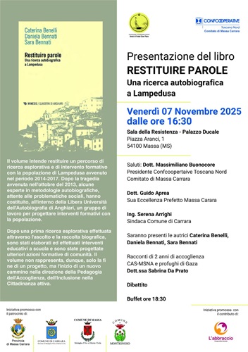 Si terrà questo venerdì 7 novembre 2025 alle ore 16.30 presso la Sala della Resistenza di Palazzo Ducale di Massa, l’evento di presentazione del volume “Restituire parole” edito da Mimensis \ Quaderni di Anghiari. Il libro è frutto di un importante percorso di ricerca esplorativa e di intervento formativo con la popolazione di Lampedusa, svolto nel periodo 2014-2017. Il periodo in cui si è svolta la ricerca è stato immediatamente successivo alla tragica strage del 3 ottobre 2013, in cui morirono 368 migranti al largo dell'isola, un evento che ha segnato profondamente la comunità locale e il dibattito nazionale e internazionale.In quegli anni, Lampedusa ha continuato a essere il principale punto di arrivo dei flussi migratori che attraversavano il Canale di Sicilia, soprattutto con l'intensificarsi delle partenze dalla Libia. La popolazione si è trovata a gestire in prima linea l'emergenza umanitaria e l'accoglienza, spesso in un clima di forte pressione mediatica e istituzionale, con un impatto significativo sulla vita sociale, economica e psicologica degli abitanti dell'isola.