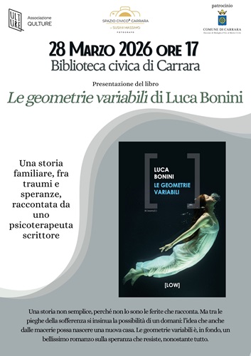 Sabato 28 marzo, alle ore 17:00, la Biblioteca civica di Carrara ospita la presentazione del nuovo romanzo dello scrittore e psicoterapeuta bresciano Luca Bonini “Le geometrie variabili”, edito da Low. La presentazione, organizzata dall’Associazione Qulture, sarà condotta da Michela Rossi, che dialogherà con l’autore sui temi del romanzo. L'opera esplora l'instabilità delle relazioni e la mutevolezza delle traiettorie esistenziali, temi che Bonini maneggia con la precisione del clinico e la sensibilità del narratore. La storia si svolge in una Torino inondata di luce, dove si incrociano le vite di Laura e Piergiulio. Lui è uno psicoanalista stimato ma un uomo irrisolto; lei è una giovane donna segnata da un’infanzia di abusi, inquieta e ambivalente verso la figlia Agata, che i servizi sociali hanno collocato in comunità. Nel tentativo di sfuggire a una solitudine divisa tra un padre anziano (reso "buono" dall'Alzheimer) e un amico di famiglia che le ha devastato l’esistenza, Laura vede in Piergiulio l'occasione per riabilitarsi e dare un padre a sua figlia. Ma mentre fra l’uomo e la bambina nasce un legame forte, Laura – vittima di una tendenza all'autosabotaggio – fatica a trovare il proprio posto in questa nuova "famiglia a geometria variabile". Nonostante il dolore, il romanzo resta una profonda storia di speranza: un racconto su come sia possibile interrompere le maledizioni familiari e spezzarne l’eredità, anche a costo di scelte dolorose, per salvare il futuro dei propri figli.