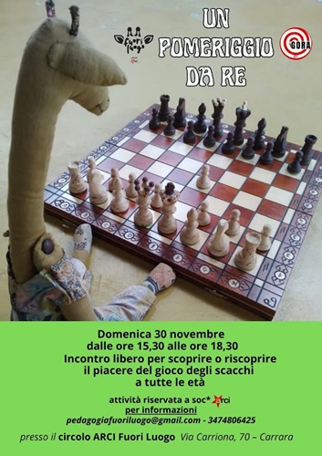 Il Gruppo Pedagogico Fuori Luogo, che da quest’anno ha avviato attività basate sugli scacchi, promuove questo appuntamento nell’ambito di un progetto più ampio dedicato alla diffusione del gioco come risorsa educativa.La scelta nasce dalla convinzione – sostenuta da una solida letteratura scientifica – che gli scacchi rappresentino un efficace strumento didattico, capace di favorire lo sviluppo cognitivo, l’autocontrollo, la concentrazione e la gestione delle emozioni. Queste caratteristiche rendono il gioco particolarmente utile anche per studenti con bisogni educativi speciali o difficoltà di attenzione, offrendo loro un contesto strutturato e motivante in cui mettere in gioco abilità cognitive e relazionali.Grazie alla collaborazione con l’associazione Apuana Soloscacchi, il Gruppo Pedagogico Fuori Luogo si propone di avvicinare al mondo degli scacchi persone di tutte le età, con particolare attenzione a bambini, ragazzi e insegnanti, e di sostenere l’introduzione del gioco nelle scuole, offrendo supporto agli educatori interessati a integrarlo nei percorsi didattici. “Un pomeriggio da Re” rappresenta, quindi, non solo un’occasione di svago e socialità, ma anche un momento per scoprire il valore educativo e relazionale degli scacchi, in un contesto accogliente e conviviale.