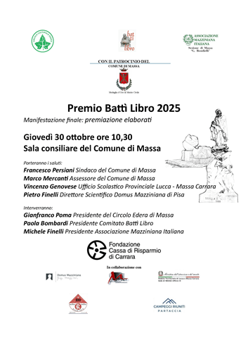 Si conclude il Premio Letterario “Battì Libro”, giunto alla XVI^ edizione, organizzato dal Circolo Culturale Endas “Edera” di Massa con lo scopo di promuovere la lettura fra gli studenti delle scuole superiori. Giovedì 30 ottobre alle ore 10,30, nella sala consiliare del comune di Massa, saranno proclamati e premiati i vincitori. L’incontro è aperto al pubblico. Porteranno i saluti il sindaco Francesco Persiani, l’assessore Marco Mercanti, Vincenzo Genovese dell’Ufficio Scolastico Provinciale Lucca – Massa Carrara e Pietro Finelli, direttore scientifico della Domus Mazziniana di Pisa. Interverranno Gianfranco Poma, presidente del Circolo “Edera”, Paola Bombardi, presidente del Comitato Battì Libro, e Michele Finelli, presidente nazionale Associazione Mazziniana Italiana. L’edizione relativa all’anno scolastico 2024/25 ha confermato la collaborazione con l’Associazione Mazziniana Italiana ed ha proposto una formula originale. Il tema proposto agli studenti è stato “Dal Risorgimento alla Resistenza. Monumenti, storia e memoria a Massa”, con l’obiettivo di offrire non solo la possibilità di approfondire un aspetto particolare e poco conosciuto della nostra città, ma anche di riflettere sul nostro passato: conoscere la storia è infatti fondamentale per comprendere il presente.Il percorso si è articolato in tre incontri. Il primo ha introdotto la tematica a livello generale ed ha avuto come relatore Roberto Balzani (docente all’Università di Bologna e presidente del Museo della Liberazione in via Tasso a Roma) sul tema “La memoria risorgimentale e resistenziale ed il suo rapporto con lo spazio urbano”. Tre sono stati invece i relatori del secondo incontro nel quale sono stati illustrati gli aspetti locali, ovvero quali sono le tracce in città del nostro passato: Michele Finelli su “Monumenti e tradizione storico politica del Risorgimento e della Resistenza a Massa”, Claudio Palandrani su “Echi del Risorgimento nell’Urbanistica e nella Toponomastica di Massa”, Massimo Ceccanti su “Documenti e monumenti: la lettura delle fonti per la storia e per la costruzione della memoria locale del Risorgimento e della Seconda guerra mondiale”. Ha chiuso il percorso Pietro Finelli con una relazione su “Pietro Finelli: La Domus mazziniana, uno spazio museale aperto alla città”. Al premio hanno partecipato studenti dell’I.I.S. “Antonio Meucci”, del Liceo Classico “Pellegrino Rossi”, del Liceo Scientifico “Enrico Fermi” e del Liceo “Giovanni Pascoli”, i quali hanno presentato relazioni scritte o filmati relativi ai contenuti trattati. Gli studenti sono stati seguiti dalle professoresse Ilaria Cavazzuti, Antonella Galluccio, Anna Maria Grasso Peroni e Laura Zocchi.Saranno premiati con buoni libro i lavori della IV BLSA del “Meucci” (“Massa in Bonaparte”), Matteo Brini della IV AINF del “Meucci”, Elisa Cuturi della II B del “Rossi” e Lorenzo Polenta della II B del “Rossi”.Il comitato scientifico del premio ha molto apprezzato la qualità degli elaborati degli studenti ed invita tutti alla cerimonia conclusiva di giovedì. Le conferenze sono state riprese dall’ingegner Ezio Della Mea e sono consultabili sul sito internet del Premio (ww.battilibro.it). Inoltre sono state pubblicate in un libretto insieme alle opere degli studenti.La manifestazione ha il patrocinio del comune di Massa e dell’Associazione Mazziniana Italiana, e viene realizzata in collaborazione con la Fondazione Cassa di Risparmio di Carrara, la Domus Mazziniana di Pisa, l’Ufficio Scolastico Territoriale IX Lucca Massa-Carrara, l’I.I.S. “Antonio Meucci”, l’azienda Campeggi Riuniti Partaccia.