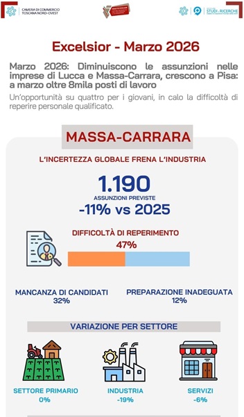 Le imprese delle province di Lucca, Massa-Carrara e Pisa prevedono di assumere complessivamente 8.060 lavoratori nel mese di marzo 2026, un dato in lieve calo rispetto allo stesso mese dell'anno precedente. La diminuzione riguarda in particolare Lucca (-10 per cento) e Massa-Carrara (-11 per cento), mentre Pisa va in controtendenza registrando una crescita (+2 per cento). Circa un quarto delle nuove opportunità di lavoro è esplicitamente indirizzato agli under 30, in lieve flessione rispetto al 2025. Il perimetro delle opportunità per i giovani risulta tuttavia più ampio se si considera che, per un ulteriore 30 per cento circa delle entrate programmate, le imprese indicano l'età anagrafica come variabile non discriminante ai fini dell'assunzione. Le maggiori occasioni dirette per i giovani si concentrano nei settori della ristorazione e del commercio, ma resta significativa anche la richiesta di operai specializzati. Le imprese continuano inoltre a segnalare difficoltà nel reperire personale, sebbene il fenomeno sia in parziale attenuazione rispetto all'anno precedente. In media, poco meno di una posizione su due resta di difficile copertura. Le criticità maggiori si evidenziano a Massa-Carrara (47 per cento), seguita da Pisa (44 per cento) e Lucca (43 per cento).Questo, in sintesi, è quanto emerge dai dati rilevati per il mese di marzo 2026 su un campione di imprese con dipendenti delle province di Lucca, Massa-Carrara e Pisa dal Sistema informativo Excelsior, indagine su base provinciale realizzata da Unioncamere in collaborazione con il Ministero del Lavoro e delle Politiche Sociali ed elaborati dalla Camera di Commercio della Toscana Nord-Ovest e dall'Istituto Studi e Ricerche - ISR.