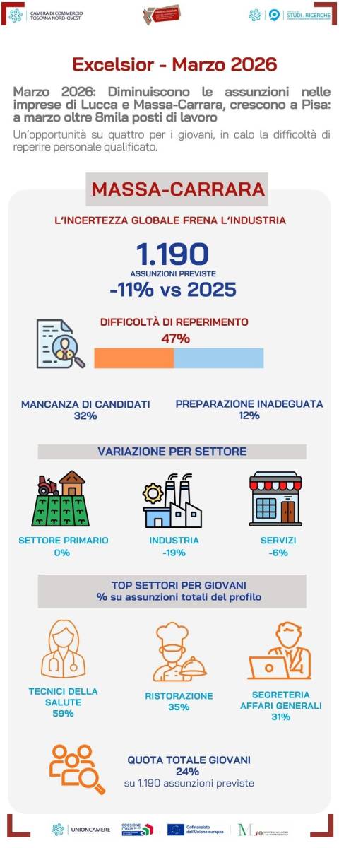 «I dati di marzo confermano che il mercato del lavoro nei nostri territori mantiene una domanda sostenuta, con oltre 8.000 assunzioni programmate – afferma Valter Tamburini, presidente della Camera di Commercio della Toscana Nord-Ovest –. Favorire l'incontro tra domanda e offerta, soprattutto per i giovani, resta una delle nostre priorità: per questo abbiamo attivato percorsi formativi mirati, in sinergia con Fondazione ISI e il Polo Tecnologico Lucchese, per costruire un ponte concreto tra il sistema scolastico e le esigenze delle imprese». In provincia di Massa-Carrara, le imprese prevedono 1.190 assunzioni a marzo, in diminuzione dell'11 per cento rispetto all'anno precedente. A pesare è soprattutto la contrazione del settore industriale (-19 per cento, 390 ingressi), ma anche i servizi registrano una flessione (-6 per cento, 770 entrate). In forte calo la difficoltà di reperimento dei lavoratori, scesa di 9 punti percentuali al 47 per cento. Le opportunità di lavoro dirette agli under 30 rappresentano il 24 per cento del totale (circa 280 ingressi), affiancate da un ulteriore 28 per cento di entrate senza specifici limiti anagrafici. Anche nel territorio apuano la ristorazione si conferma il settore più ricettivo per la fascia giovanile (35 per cento), seguita dalle professioni di segreteria e affari generali (31 per cento) e dalle vendite (23 per cento). Più contenuta la richiesta di giovani operai specializzati (20 per cento), ambito in cui le aziende locali prediligono personale che abbia già maturato esperienza. Da segnalare, tra i profili ad alta specializzazione (25 per cento di under 30 in media), un'elevata richiesta di giovani tecnici della salute.