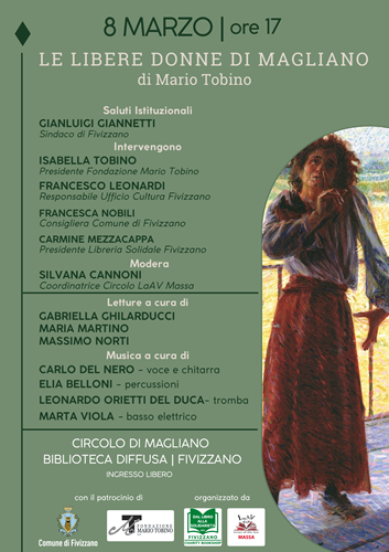 L'incontro, organizzato in occasione della Giornata Internazionale della Donna, sarà aperto dai saluti istituzionali del Sindaco di Fivizzano, Giancarlo Giannetti. Interverranno Francesco Leonardi, responsabile dell'ufficio cultura del Comune, Francesca Nobili, Consigliera comunale e Carmine Mezzacappa, Presidente della ODV Dal Libro alla Solidarietà. La conduzione sarà affidata a Silvana Cannoni, coordinatrice di LaAV, Circolo di Letture ad Alta Voce di Massa. Le letture saranno curate da Gabriella Ghilarducci, Maria Martino e Massimo Norti, di LaAV Massa, accompagnate da interventi musicali dal vivo. Carlo Del Nero voce e chitarra e i giovani Marta Viola al basso elettrico, Elia Belloni alle percussioni, Leonardo Orietti Del Duca alla tromba. L'evento segna l'avvio ufficiale delle attività culturali della Biblioteca Diffusa di Magliano, che intende diventare un punto di riferimento stabile per la promozione della lettura e della partecipazione attiva nel territorio.