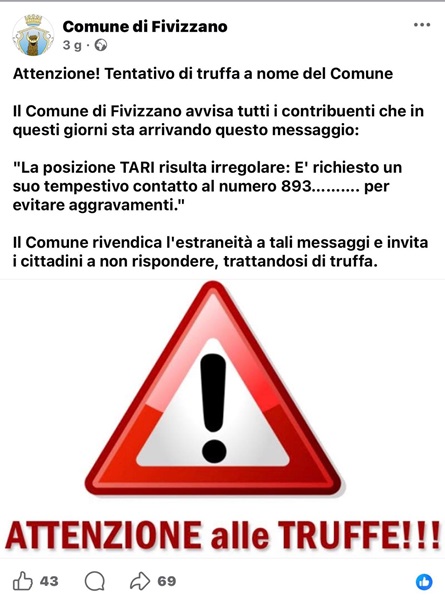 Non chiamate quel numero! È questa l’indicazione che arriva dal Comune di Fivizzano, che negli ultimi giorni ha lanciato un’allerta urgente rivolta a tutti i contribuenti. È in corso, infatti, un tentativo di truffa ben architettato che sfrutta il nome dell’ente per indurre i cittadini a compiere chiamate anomale. Come funziona il raggiro: il meccanismo è tanto semplice quanto insidioso. Molti cittadini stanno ricevendo sul proprio telefonino un messaggio che segnala una presunta irregolarità nella propria posizione TARI (la tassa sui rifiuti). Il testo del messaggio, studiato per generare ansia e premura, recita pressappoco così "la posizione TARI risulta irregolare: è richiesto un suo tempestivo contatto al numero 893..". Facendo leva sulla paura di incorrere in sanzioni o complicazioni burocratiche, i truffatori spingono la vittima a chiamare un numero di telefono per "regolarizzare" la situazione. In realtà, chiamando quel numero, il cittadino non sta parlando con gli uffici comunali, ma sta cadendo in una vera e propria truffa. Tramite la propria pagina Facebook, il comune ha preso le distanze informando i cittadini che non è in questo modo che avvengono le comunicazioni tra ente e contribuenti. Queste azioni sono sempre più all'ordine del giorno e perfezionate col tempo. Per evitare di cadere in queste trappole è necessario controllare sempre la fonte e nel caso rivolgersi alla polizia postale.