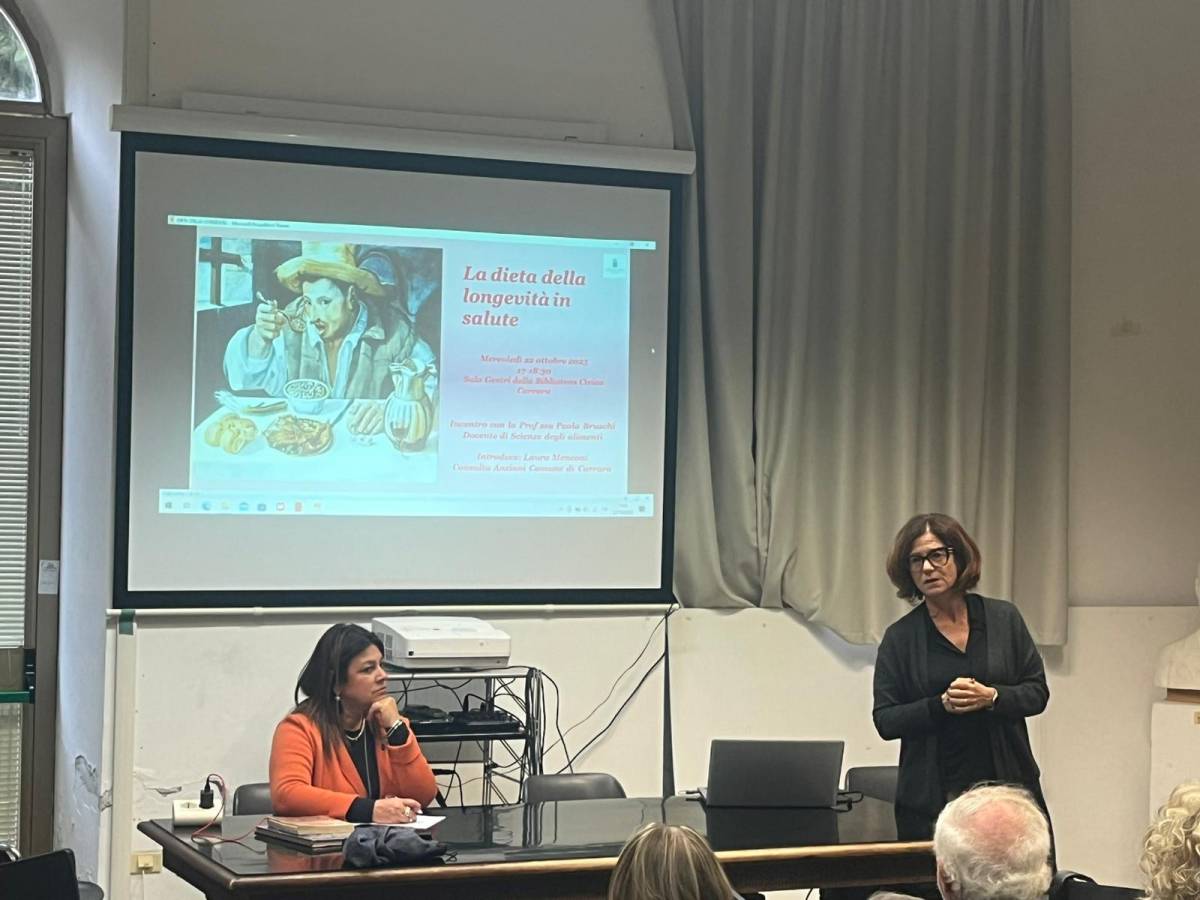 Si è svolto con grande successo l'incontro organizzato dalla Consulta Anziani del Comune di Carrara e coordinato da Laura Menconi, presidente ADA – Associazione per i Diritti degli Anziani di Carrara e Fosdinovo. Intitolato 'La dieta della longevità in salute', era dedicato al tema dell'alimentazione come strumento di prevenzione e benessere e si è svolto nella Sala Gestri della biblioteca civica di Carrara. L'evento, molto partecipato, ha visto anche la presenza dell'assessora del Comune di Carrara Gea Dazzi, intervenuta per un saluto istituzionale e aveva come protagonista la professoressa Paola Bruschi, docente di Scienze degli alimenti.Durante l'incontro sono stati affrontati argomenti di grande rilevanza per la salute pubblica, tra cui le corrette abitudini alimentari per preservare il benessere fisico e ridurre l'incidenza di patologie diffuse come malattie cardiovascolari, ipertensione e diabete. Numerose le domande e gli spunti emersi dal pubblico, segno di un forte interesse e di una crescente consapevolezza sui temi trattati.È emerso, in particolare, un dato preoccupante: le giovani generazioni adottano spesso regimi alimentari squilibrati, lontani dai principi della dieta mediterranea e dalle tradizioni locali. Da più parti è stato sottolineato il valore di un ritorno a un'alimentazione "povera" ma equilibrata, quella dei nostri nonni, basata su semplicità, stagionalità e varietà.«Abbiamo voluto promuovere un momento di confronto aperto e concreto – ha dichiarato Laura Menconi, presidente ADA Carrara e Fosdinovo – perché crediamo che la salute si costruisca anche a tavola, ogni giorno. È fondamentale educare, informare e sensibilizzare, soprattutto i più giovani, sull'importanza di una dieta sana e consapevole. Il nostro impegno come associazione è quello di continuare a proporre iniziative che mettano al centro la persona e il suo benessere.»