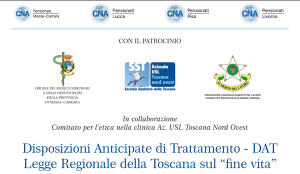 Si terrà sabato 28 Marzo dalle h. 9:30, nella sala convegni dell'Autorità di Sistema Portuale del Mar Ligure Orientale in Viale Colombo 6 a Marina di Carrara, un importante convegno di carattere informativo, organizzato dalla CNA Pensionati di Massa-Carrara unitamente alle CNA Pensionati di Lucca, Pisa e Livorno, in collaborazione con il Comitato dell'Azienda USL Toscana nord ovest per l'etica nella clinica dal titolo "Disposizioni Anticipate di Trattamento - DAT - Legge Regionale della Toscana sul fine vita". All'evento, che ha ricevuto il patrocinio dell'Azienda USL Toscana nord ovest, dell'Ordine dei Medici Chirurghi e degli Odontoiatri, nonché della Federazione Nazionale dei Maestri del Lavoro, parteciperà il presidente della Regione Toscana Eugenio Giani.Il convegno ha lo scopo di informare i cittadini sulle "Disposizioni Anticipate di Trattamento", che sono espressioni della volontà di una persona maggiorenne e capace di intendere e di volere riguardo ai trattamenti sanitari futuri, nel caso in cui non sia più in grado di autodeterminarsi. Attraverso le DAT è possibile esprimere il consenso o il rifiuto rispetto ad accertamenti diagnostici, scelte terapeutiche e singoli trattamenti sanitari, promovendo la relazione di cura e fiducia tra paziente e medico. Sarà poi illustrata la Legge della Regione Toscana sul "fine vita" che in Italia è il primo atto concreto che regola il "suicidio medicalmente assistito" che non è "eutanasia" in quanto è la stessa persona che assume il farmaco letale o a premere il pulsante per l'iniezione.Il convegno sarà presentato e aperto da Gino Angelo Lattanzi, presidente della CNA Pensionati di Massa-Carrara, al quale faranno seguito i saluti della sindaca di Carrara Serena Arrighi, del presidente della CNA Toscana Luca Tonini e del presidente nazionale CNA Pensionati Lorenzo Marchetti.