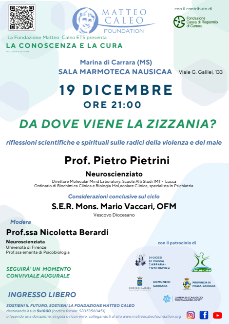 Venerdi 19 dicembre alle ore 21:00 presso la sala Marmoteca a Marina di Carrara (sede di Nausicaa, viale Galilei 133) , si terrà l’incontro conclusivo per il 2025 de “La Conoscenza e la Cura”, il ciclo di conferenze organizzato dalla Fondazione Matteo Caleo in collaborazione con la Diocesi di Massa-Carrara-Pontremoli, il contributo della Fondazione Cassa di Risparmio di Carrara, il patrocinio della Provincia di Massa-Carrara, dei Comuni di Carrara, Massa e Pontremoli, dell’azienda Nausicaa e della camera di Commercio Nord Ovest Toscana. Nell’arco di un anno il territorio di Massa-Carrara ha visto protagonisti grandi nomi delle neuroscienze, la pedagogia e la psicologia italiane ( Scuona Nomrmale SUperiore, Università di Parma, Firenze, Cattolica di Milano) quali la prof.ssa Ersilia Menesini, il prof. Marco Orsi, il prof. Tommaso Pizzorusso, il prof. Leonardo Fogassi, il prof. Pierpaolo Triani, il prof. Pietro Pietrini coordinati dalla prof.ssa Nicoletta Berardi (Università di Firenze). L’incontro di venerdì 19 dal titolo, “Da dove viene la zizzania: riflessioni scientifiche e spirituali sulle radici della violenza e del male” vedrà l’intervento del prof. Pietro Pietrini cui seguiranno il dibattito e le conclusioni del vescovo diocesano Mons. Mario Vaccari, coordinati dalla prof.ssa Berardi.Di fronte ai frequenti episodi di violenza, spesso perpetrati anche da ragazzi molto giovani, rimaniamo sbigottiti e ci chiediamo come sia possibile che questo accada.Il professor Pietro Pietrini neuroscienziato ed esperto conoscitore del cervello umano, ci farà riflettere sulle radici della violenza e del male. L’ingresso è libero e aperto a tutti. Seguirà un momento conviviale per gli auguri di buone feste. Per gli interessati sarà possibile ricevere attestato di partecipazione.