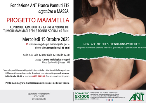 Progetto Mammella Over 45: Il giorno 15 ottobre saranno disponibili 16 visite gratuite. L’esame comporta visita senologica, mammografia mammaria tutto ciò grazie all’impegno profuso dai Volontari della Delegazione di Massa-Carrara, Lucca La Spezia nell’attività di raccolta fondi e grazie a tutti i sostenitori sul territorio. Le visite nell’ambito del” Progetto Mammella ANT” per la prevenzione dei tumori della mammella saranno effettuate presso lo Studio Radiologico Mergoni, piazza Garibaldi 9/3, Massa 54100.