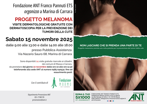 A novembre saranno disponibili per i cittadini dei Comuni di Massa e Carrara 24 visite di prevenzione oncologica gratuita.Grazie al Progetto melanoma di ANT sarà possibile accedere a visite specializzate con l’ausilio del dermatoscopio per il controllo dei nevi e la diagnosi tempestiva di lesioni sospette e/o neoplastiche. La giornata, si terrà 15 novembre 2025 presso gli ambulatori della Pubblica Assistenza Via Nazario Sauro 68 Marina di Carrara dalle ore 9.00 alle 13.00 e dalle 14.00 alle 18.00 Per accedere alle visite è obbligatoria la prenotazione telefonica, telefonando alla sede ANT al numero 0585 040532 dalle ore 10.00 alle 12:30 fino ad esaurimento posti il giorno 10 novembre 2025. L’iniziativa è stata resa possibile grazie al sostegno di Fondazione Marmo. “La prevenzione salva le vite ed è il miglior approccio per garantire per quanto possibile la salute delle persone.”I progetti di prevenzione di ANT hanno un valore importantissimo, perché riportano l'attenzione sulla prevenzione oncologica, gravemente trascurata nei mesi dell'emergenza Covid-19. Una recente indagine dell’Osservatorio Nazionale Screening ha certificato che nel 2020 sono stati 4 milioni gli inviti in meno relativi agli screening oncologici e 2,5 milioni i mancati esami effettuati. Test venuti meno che si sono tradotti in un ritardo di 5 mesi nell’effettuazione degli screening. Numeri importanti che purtroppo significano diagnosi più tardive.Ogni mese, visitando la sezione prevenzione del sito ant.it/toscana, sarà possibile trovare le date e le modalità di prenotazione delle visite di prevenzione oncologica gratuita organizzate da ANT in Toscana. Per le richieste di assistenza domiciliare gratuita e specializzata per i malati di tumore e per avere informazioni sulle attività di ANT in Toscana, è possibile contattare la sede di Massa-Carrara Lucca La Spezia al numero 0585 040532