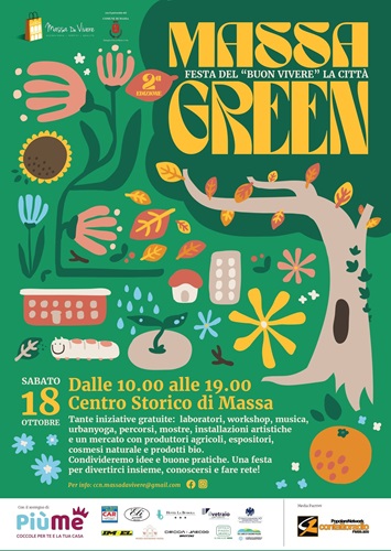 Architetta e Counselor Professionista, in collaborazione con Consuelo di "Casa Kim". S potrà approfondire il rapporto tra arte e benessere atteraverso il laboratorio di" Arte e creatività...per il tuo tempo ritrovato" a cura di Maurizio Fruzzetti in via Cairoli e in Piazza Aranci con il laboratorio "Acquarello come arte-terapia", le potenzialità terapeutiche della tecnica pittorica dell’acquerello, un workshop a cura di Arianna Guadagni. Sempre in Piazza Aranci sarà possibile realizzare una ghirlanda di fiori e piante autunnali alle 14.15 con "L'Aura dei Fiori" mentre in via Guglielmi Severino Meloni farà una dimostrazione pratica di come dare "Nuova vita al legno". Trasmetterà in diretta da Piazza Aranci mattina e pomeriggio Contatto Radio Popolare Network. L'evento "Massa Green" è realizzato dai commercianti associati al Centro Commerciale Naturale Massa da Vivere con il patrocinio del Comune di Massa.