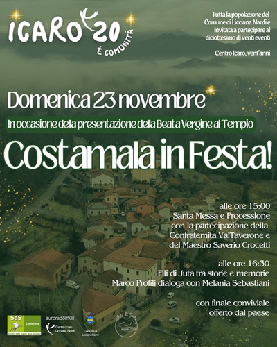 Icaro è comunità. Continua ‘Venti eventi’, venti proposte di natura diversa, con tutta la storia di Icaro e la sua peculiare caratteristica di essere un centro polivalente. Una kermesse promossa in occasione dei vent’anni del Centro polivalente di Costamala, gestito della Società della salute, che sta andando avanti da gennaio. Il prossimo evento è strettamente inserito nella comunità, si svolgerà domenica pomeriggio e si chiama ‘Costamala in festa’. Come ogni anno il borgo festeggia, in occasione della presentazione della Beata Vergine al tempio, con una Santa Messa e processione alle 15, con la partecipazione della Confraternita ValTaverone e del Maestro Saverio Crocetti. Alle 16,30 ‘Fili di Juta tra storie e memorie’, Marco Profili dialoga con Melania Sebastiani. L’associazione si occupa del recupero della memoria del Novecento industriale in Lunigiana, nei suoi pochi anni di attività, ha portato avanti collaborazioni, spaziando da rappresentazioni teatrali a mostra storica di memorabilia, passando per esposizioni di arte contemporanea, in concerto con enti pubblici, religiosi e privati, tessendo progetti con le scuole di ogni ordine e grado di Aulla. Materia prima delle attività dell’associazione rimane il contributo spontaneo della cittadinanza, corredato da approfondite ricerche d’archivio. Dopo il convegno ci sarà un momento conviviale offerto dagli abitanti del paese, tutta la popolazione è invitata a partecipare al 18esimo dei ‘Venti eventi’ promossi dal Centro Icaro. Ricordiamo inoltre che sono ricominciati i laboratori, da segnalare ‘Il pranzo è servito’, laboratorio di cucina per imparare dall’antipasto al dolce, alla ricerca del menù completo, che si svolgerà il mercoledì dalle 16 alle 18.