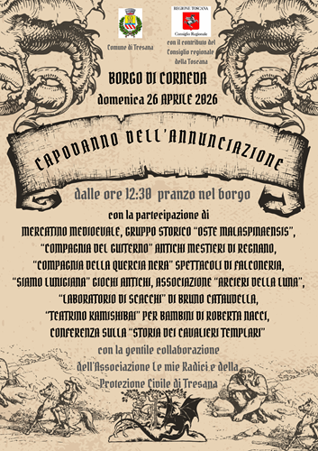 Il Capodanno dell'Annunciazione celebra la data in cui in Toscana, fino al 1749, iniziava l'anno civile, commemorando l'incarnazione di Gesù. Questa tradizione religiosa, che ricorda l'annuncio dell'Arcangelo Gabriele a Maria, è oggi rievocata con parate storiche in molti Comuni toscani. Domenica 26 aprile anche le viuzze del Borgo di Corneda, riqualificato quale area mercatale, tornano ad ospitare l'evento , la cui prima edizione si è svolta nel 2019. "Per noi ormai è un appuntamento fisso che richiama molti turisti - afferma il Sindaco di Tresana Matteo Mastrini -. Rigenerazione urbana e rigenerazione culturale sono azioni che fanno parte della stessa idea: riqualificare i borghi e farli vivere organizzando eventi. In questo quadro si inserisce anche il Borgo di Corneda, il primo ad essere oggetto di pavimentazione e illuminazione, cui hanno fatto seguito gli interventi realizzati nel Borgo del Castello di Tresana e nel Borgo di Canala". La giornata si aprirà alle 10:45 con l'inaugurazione alla presenza delle autorità: il centro storico si popolerà con il mercatino medioevale, il gruppo storico Oste Malaspinaensis, la Compagnia del Guiterno con gli antichi mestieri di Regnano, la Compagnia della Quercia nera con gli spettacoli di falconeria, SiAmo Lunigiana con i giochi antichi, l'associazione Arcieri della Luna, il laboratorio di scacchi di Bruno Cataudella, il teatrino kamishibai per bambini di Roberta Nacci, la conferenza sulla storia dei Cavalieri templari. "Un tuffo nel passato con iniziative di rievocazione storica curate in ogni dettaglio. Dobbiamo ringraziare - prosegue Mastrini - l'Associazione Le mie Radici e la Protezione Civile di Tresana per la gentile collaborazione e il Consiglio regionale della Toscana per il contributo che ci permette di organizzare l'evento". E' prevista la possibilità di pranzare nel borgo dalle ore 12.30 con prodotti tipici locali.