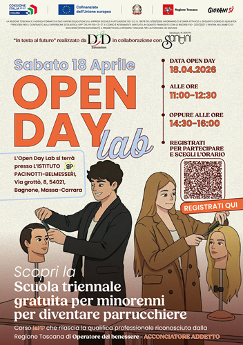 Sabato 18 aprile, presso l’IIS Pacinotti – Belmesseri di Bagnone, si terrà l’Open Day Lab del percorso triennale di Istruzione e Formazione Professionale (IeFP) “In testa al futuro”, la scuola triennale gratuita per minorenni che forma per diventare parrucchieri.Il percorso, promosso dalla Regione Toscana e finanziato con risorse del PR FSE+ 2021–2027 nell’ambito del progetto Giovanisì, è rivolto a ragazzi e ragazze dai 14 ai 17 anni. Consente di assolvere l’obbligo scolastico e di ottenere, al termine del triennio, una qualifica professionale riconosciuta di Acconciatore Addetto (livello EQF 3), valida anche a livello europeo.A organizzare il corso è D&D Education, agenzia formativa accreditata dalla Regione Toscana, in collaborazione con Accademia Santini, realtà di riferimento nel settore Hair & Beauty dal 1991. Uno degli elementi distintivi del percorso è il forte orientamento pratico: su un totale di 2.970 ore, 800 sono dedicate ad attività di stage in saloni professionali. Gli studenti alternano lezioni teoriche, attività di laboratorio e formazione sul campo, acquisendo competenze tecniche come taglio, piega, acconciatura, insieme a una preparazione di base completa che comprende anche italiano, matematica, storia e altre materie fondamentali. Tutti i materiali didattici e professionali sono inclusi e a ogni studente viene fornito un tablet personale a supporto dello studio e della didattica digitale.