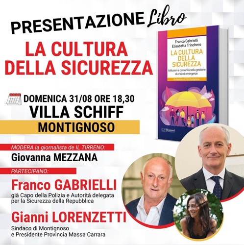 La cultura della sicurezza come chiave per affrontare le sfide del presente e del futuro sarà al centro della presentazione del libro “La cultura della sicurezza. Istituzioni e comunità nella gestione di crisi ed emergenze” di Franco Gabrielli ed Elisabetta Trinchero, in programma domenica 31 agosto alle ore 18.30 a Villa Schiff, Montignoso.Un incontro di grande rilevanza, che vedrà la partecipazione di Franco Gabrielli, già Capo della Polizia e Autorità delegata per la Sicurezza della Repubblica, e di Gianni Lorenzetti, Sindaco di Montignoso e Presidente della Provincia di Massa-Carrara. A moderare il dialogo sarà la giornalista de Il Tirreno Giovanna Mezzana. In un mondo sempre più interconnesso e vulnerabile, la gestione delle crisi e delle emergenze impone nuove visioni, strategie e strumenti capaci di rispondere alla complessità. Il saggio proposto da Gabrielli e Trinchero rappresenta un percorso rigoroso che intreccia teoria e pratica, analizzando i principali nodi della contemporaneità: dalla distinzione concettuale tra crisi ed emergenze alla costruzione della resilienza, dalla fiducia come base della collaborazione istituzionale all’utilizzo di strumenti innovativi come i living labs.Il volume, articolato in cinque capitoli e arricchito da casi concreti, dedica ampio spazio anche al tema cruciale della comunicazione, indagandone gli aspetti etici, normativi e tecnologici, con uno sguardo attento anche al ruolo dei social media. Le conclusioni aprono alla prospettiva di una governance partecipativa, in cui le crisi non siano soltanto momenti di difficoltà, ma occasioni di apprendimento, innovazione e costruzione condivisa tra istituzioni e comunità. L’appuntamento di Montignoso si propone dunque come un’occasione di riflessione e confronto su un tema centrale per la società contemporanea, offrendo spunti di grande valore a studiosi, professionisti e cittadini interessati a comprendere e affrontare le sfide del nostro tempo.