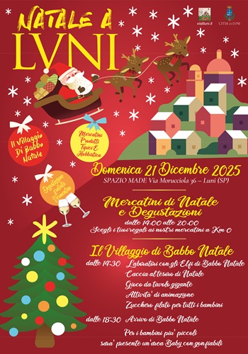 Luni si prepara a vivere la magia del Natale con “Natale a Luni”, in programma sabato 21 dicembre 2025 presso Spazio MADE, in via Morucciola 36.Una giornata pensata per famiglie, bambini e visitatori di tutte le età, dedicata al piacere di stare insieme e di vivere le festività in una location suggestiva e accogliente, capace di rendere ancora più speciale questo periodo dell’anno. Nel corso della giornata, i bambini saranno i veri protagonisti. I più piccoli potranno divertirsi in totale sicurezza grazie alla presenza di gonfiabili, mentre l’animazione natalizia accompagnerà i momenti di gioco e di festa. Per i bambini più grandi sono previsti laboratori creativi, attività manuali e giochi strutturati, pensati per stimolare fantasia, curiosità e collaborazione, oltre a una coinvolgente caccia al tesoro a tema natalizio. Non mancherà il Villaggio di Babbo Natale, luogo simbolo dell’attesa e della meraviglia, e per rendere l’esperienza ancora più dolce, zucchero filato per tutti i bambini, piccolo ma immancabile elemento di festa.Accanto alle attività dedicate ai più giovani, anche gli adulti e le famiglie potranno vivere il Natale in modo autentico e conviviale. I mercatini natalizi offriranno proposte artigianali e idee regalo, mentre una degustazione gratuita di Vermentino DOC e di prodotti tipici locali permetterà di scoprire e apprezzare le eccellenze enogastronomiche del territorio lunense, raccontato attraverso i suoi sapori, la sua storia e il lavoro delle aziende locali.L’iniziativa è completamente gratuita e aperta a tutti, pensata per essere inclusiva, accessibile e capace di valorizzare il territorio anche nel periodo invernale, trasformando il Natale in un’occasione di incontro e condivisione. A sottolineare il valore dell’evento è Barbara Moretti, Assessore al Turismo e alle Attività Produttive del Comune di Luni, che dichiara: «Natale a Luni nasce dal desiderio di mettere insieme tutta la bellezza e la bontà che Luni sa esprimere e di condividerle con tutti. In questo periodo diventa ancora più importante rafforzare il senso di comunità, valorizzando i legami tra le persone e il luogo in cui vivono.».«La presenza diretta delle aziende locali, con la loro esperienza e passione, rende l’iniziativa ancora più autentica. Luni viene raccontata attraverso i suoi paesaggi, la sua storia e le sue eccellenze enogastronomiche – Vermentino DOC, birra artigianale, olio e prodotti tipici – offrendo a chi partecipa un’esperienza capace di emozionare grandi e piccoli, anche in inverno, anche a Natale.» “Natale a Luni” si conferma così come un’occasione per scoprire e riscoprire il territorio, trascorrere momenti piacevoli in famiglia e vivere la magia delle festività tra divertimento, tradizione e gusto. Sarà possibile parcheggiare nel parcheggio dello Spazio MADE, fino a esaurimento posti. In alternativa, sono disponibili parcheggi in via Morucciola, oltrepassato lo Spazio MADE, a circa 200 metri in direzione Aurelia (2 minuti a piedi).