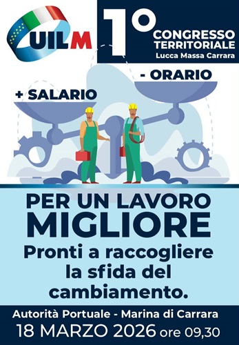 Il 1° Congresso Territoriale di UILM Lucca Massa Carrara di terrà martedì 18 marzo 2026 alle ore 9.30 presso l'Autorità Portuale di Marina di Carrara. All'iniziativa sarà presente Rocco Palombella, segretario nazionale UILM, che aprirà il confronto sulle sfide decisive per il settore metalmeccanico e per il lavoro. Tra i temi centrali del congresso ci sarà anche la situazione del cantiere navale TISG – The Italian Sea Group, realtà strategica per l'area apuana e oggi al centro di una fase complessa, tra tensioni finanziarie, prospettive di risanamento e preoccupazioni per l'occupazione .Il congresso sarà l'occasione per fare il punto sulle priorità sindacali, sulle prospettive industriali e sulle proposte della UILM per garantire più salario, meno orario e un lavoro migliore, in linea con il messaggio della campagna congressuale.