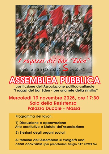 Si comunica che il giorno mercoledì 19 novembre, con inizio ore 17:30, presso la Sala della Resistenza di Palazzo Ducale a Massa, “I Ragazzi del Bar Eden” organizzano un’assemblea generale pubblica aperta per la trasformazione del gruppo, nato oltre un anno fa, in un’associazione politico-culturale. L’associazione, che assumerà la denominazione “I Ragazzi del Bar Eden – per una rete della sinistra”, sarà regolata, oltre che dalle disposizioni legislative sulle Associazioni non riconosciute (artt.36-38 C.C.), da quelle contenute nel nell’Atto Costitutivo e dello Statuto Sociale. Saranno Organi Sociali: a) l’Assemblea dei Soci e Socie; b) il