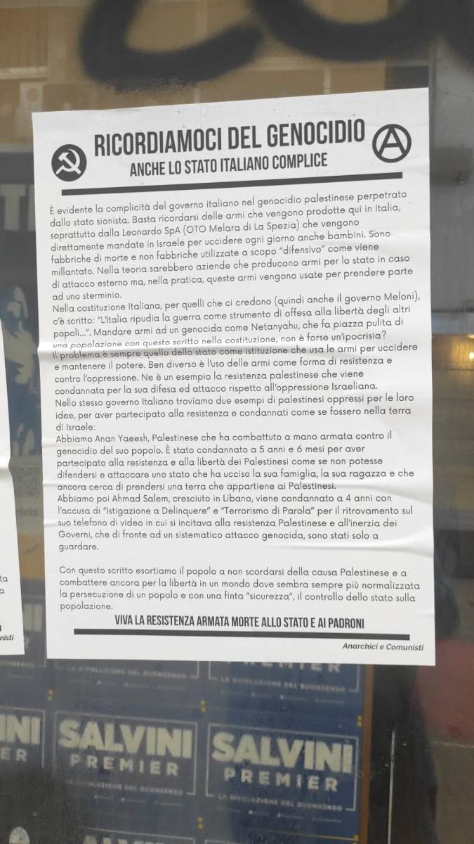 La sede provinciale della Lega Massa Carrara è stata imbrattata con scritte violente contro lo stato nelle prime ore del 25 aprile, giorno della Liberazione. La firma è quella degli anarchici, che, tuttavia, con la solita somma coerenza hanno scelto proprio il giorno più significativo per rendere onore ai partigiani che aiutarono gli Alleati a liberare l'Italia dal nazifascismo: un vero messaggio di democrazia, di rispetto e di accoglienza degli altri, che vale, ovviamente solo quando sono graditi. Se sgraditi allora vanno bene anche i campi di concentramento nazisti o la morte, appunto. Perchè loro sono antifascisti. A riferire l'accaduto è Andrea Tosi, segretario provinciale della Lega Massa Carrara: "Nelle scorse ore la sede provinciale della Lega è stata imbrattata con scritte contro il vicepresidente del Consiglio Matteo Salvini, simboli anarchici e frasi come “morte allo Stato”. Non è vandalismo. È un segnale chiaro, grave, e profondamente preoccupante.Qui non siamo più davanti a episodi isolati. Da tempo esiste un clima di odio crescente, visibile, concreto. Questa volta si è superato ogni limite. Quando compaiono frasi che richiamano alla violenza e alla distruzione dello Stato, non si può più parlare di protesta. Si parla di estremismo preoccupante. Chi compie questi gesti non cerca confronto. Vuole intimidire. Vuole spaventare. Vuole creare un clima in cui chi fa politica alla luce del sole debba avere paura. E questo è inaccettabile. Questa gente fa della violenza un metodo e un credo. Non sono semplici provocatori. Sono soggetti che ritengono legittimo colpire, minacciare, zittire e anche peggio. E questo deve preoccupare tutti, non solo una parte politica. Perché oggi colpiscono una sede della Lega. Domani può toccare a chiunque. Quando passa il principio che si può agire così contro chi non la pensa allo stesso modo, la democrazia è già sotto attacco. Noi non arretriamo. Non ci facciamo intimidire. Ma non sottovalutiamo più nulla. Serve una presa di posizione netta, senza ambiguità. Serve condannare questi fatti per quello che sono: atti di odio politico e tentativi di intimidazione violenta. Il silenzio, oggi, è complicità".
