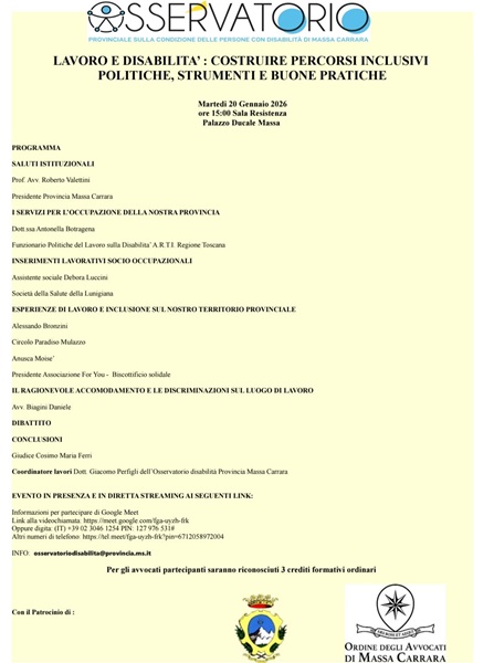 L'Osservatorio Provinciale sulla Condizione delle Persone con Disabilità di Massa Carrara ha organizzato martedì 20 gennaio 2026, presso la Sala della Resistenza di Palazzo Ducale a Massa, il convegno "Lavoro e disabilità: costruire percorsi inclusivi - Politiche, strumenti e buone pratiche".L'evento, che gode del patrocinio della Provincia di Massa Carrara e dell'Ordine degli Avvocati di Massa Carrara, rappresenta un'importante occasione di confronto tra istituzioni, operatori del settore e associazioni del territorio, sul tema cruciale dell'inclusione lavorativa delle persone con disabilità. Dopo i saluti istituzionali di Roberto Valettini, Presidente della Provincia di Massa Carrara, il programma ha visto diversi interventi qualificati. La dottoressa Antonella Botragena, Funzionario Politiche del Lavoro sulla Disabilità della Regione Toscana, illustrerà i servizi per l'occupazione disponibili nella provincia. Di seguito ci sono state testimonianze di inserimenti lavorativi socio-occupazionali e esperienze concrete di lavoro e inclusione sul territorio provinciale, con gli interventi di rappresentanti del Circolo Paradiso Mulazzo, dell'Anusca Moisè e dell'Associazione For You - Biscottificio solidale.