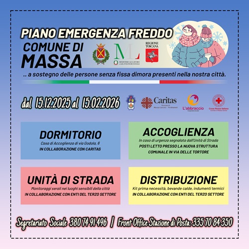 Con l’arrivo dei mesi più freddi, il Comune di Massa rinnova anche per l’inverno 2025/2026 il proprio impegno a tutela delle persone più fragili, attivando il Piano Emergenza Freddo, operativo dal 15 dicembre 2025 al 15 febbraio 2026. Un Piano che non è solo un insieme di interventi, ma una risposta collettiva di solidarietà, costruita insieme agli Enti del Terzo Settore che fanno parte del Tavolo Solidale comunale, una rete di realtà che ogni giorno operano sul territorio accanto a chi vive condizioni di grave marginalità e solitudine. «Il Piano Emergenza Freddo rappresenta il modo in cui una comunità sceglie di non voltarsi dall’altra parte», dichiara il Sindaco Francesco Persiani. «Di fronte al freddo, alla fragilità, e alla solitudine, il nostro territorio risponde con un lavoro di squadra che unisce istituzioni e volontariato per non lasciare indietro nessuno. La collaborazione con Caritas, Misericordia, Croce Rossa Italiana, Cooperativa Sociale L’Abbraccio, Fondazione ANT e le altre realtà del Terzo Settore ci consente di essere presenti, di intercettare il bisogno e di offrire risposte concrete e tempestive». Il Piano Emergenza Freddo si articola in una serie di interventi coordinati rivolti alle persone senza fissa dimora presenti sul territorio comunale: