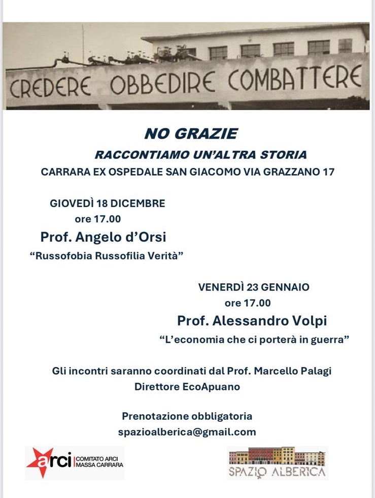 Il Circolo Spazio Alberica apre un cantiere di pensiero su Pace, Guerra ed Economia con due voci fuori dal coro Dall'ex Ospedale San Giacomo, un luogo simbolo di rigenerazione, parte un percorso culturale controcorrente. Si inizia il 18 dicembre con il professor Angelo D'Orsi su "Russofobia, Russofilia, Verità", seguito il 23 gennaio dal professor Alessandro Volpi che smonta "L'economia che ci porterà in guerra". Non il solito evento, ma l'avvio di un vero e proprio cantiere culturale. Il Circolo Spazio Alberica, realtà apuana che da tempo lavora come laboratorio di idee alternativo al mainstream, lancia un percorso di studio e confronto sulle grandi questioni che scuotono il nostro presente: i conflitti globali, le narrazioni ufficiali da smascherare e le logiche economiche che guidano (spesso verso l'abisso) le relazioni internazionali. Un progetto che si articola in due appuntamenti di alto profilo, con due relatori di chiara fama, accomunati dalla capacità di portare nelle piazze e nelle sale il rigore dell'analisi universitaria, senza perdere il coraggio della critica e la passione civile. Si comincia giovedì 18 dicembre alle ore 17.00 nella sede del Circolo (ex Ospedale San Giacomo, Via Grazzano 17, Carrara) con un incontro dal titolo quanto mai attuale: "Russofobia Russofilia Verità". Ospite d'onore il Professor Angelo D'Orsi, storico di fama, profondo conoscitore di Gramsci e acuto analista delle dinamiche geopolitiche. D'Orsi, impegnato nella costruzione di un movimento per un'informazione libera dai condizionamenti, porterà la sua riflessione critica sui conflitti in Ucraina e Palestina, partendo dalla sua esperienza personale di studioso che ha subito tentativi di censura per le sue posizioni. Un monito a difendere la libertà di parola e il diritto a una narrazione complessa e dialettica dei fatti. Il percorso prosegue venerdì 23 gennaio, sempre alle 17.00, con un altro big dell'accademia e della divulgazione: il Prof. Alessandro Volpi. Il suo intervento, "L'economia che ci porterà in guerra", promette di squarciare il velo sui meccanismi finanziari e commerciali che, spesso invisibili ai più, costruiscono le premesse materiali dei conflitti. La sua riconosciutissima competenza sarà la bussola per orientarsi in un labirinto in cui l'economia non è più solo una questione di spread, ma di guerra e pace. Entrambi gli incontri saranno coordinati dal Professor Marcello Palagi, Direttore di EcoApuano. Con queste iniziative, il Circolo Spazio Alberica ribadisce la sua missione, che non è quella di offrire sporadici momenti di riflessione, ma di avviare un percorso sistematico di Informazione, Formazione e Sviluppo. Un progetto che mette al centro la cultura come strumento di condivisione e rigenerazione, anche urbana, a partire da un luogo simbolo come l'ex Ospedale San Giacomo. Non un circolo di ascolto, ma un laboratorio di pensiero. Non una voce partitica, ma una comunità che critica, analizza e propone. L'appuntamento è per costruire insieme, a partire da queste due date, un altro punto di vista sul mondo. -- Inviato da Virgilio Mail Inviato da Silvano Leoni