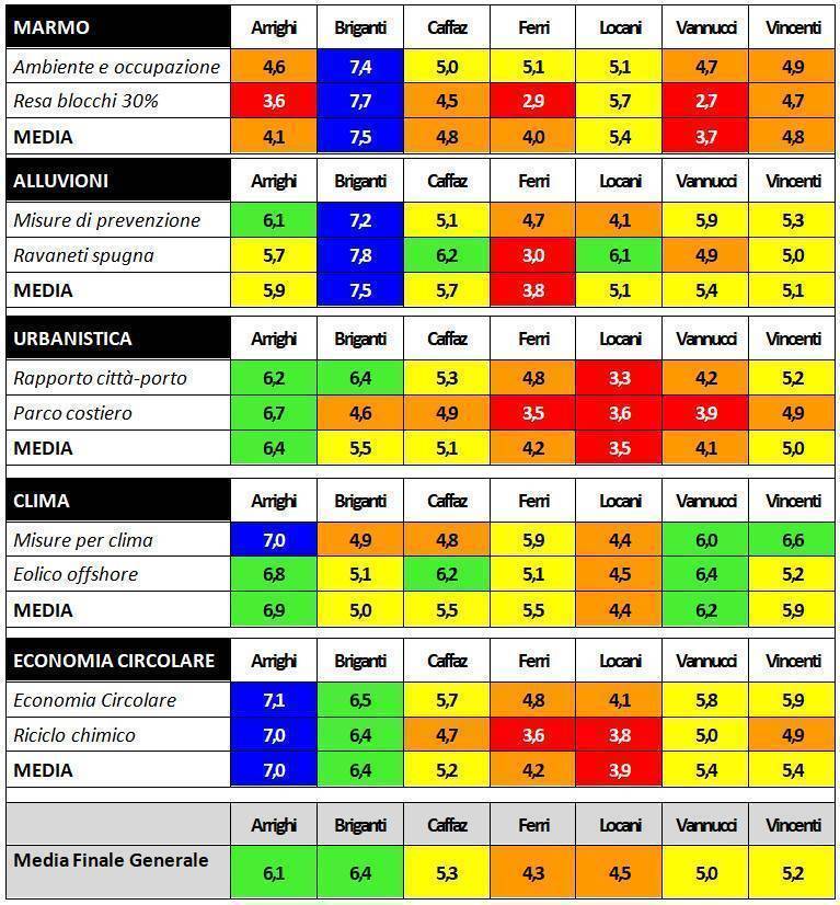 Il gruppo di tredici “valutatori”, tutti soci del circolo di Legambiente Carrara, ha espresso i propri giudizi sulla base di specifici criteri e di un particolare “parametro”: quanto, cioè, le candidate e i candidati – in occasione del dibattito – abbiano espresso posizioni ed argomentazioni vicine (o meno) alle elaborazioni dell’associazione su temi che spaziavano dal marmo e l’escavazione al dissesto idrogeologico e la messa in sicurezza del territorio, dal porto e la sua relazione con la città e l’ambiente al tema della decarbonizzazione e delle energie rinnovabili fino a quello dell’economia circolare.