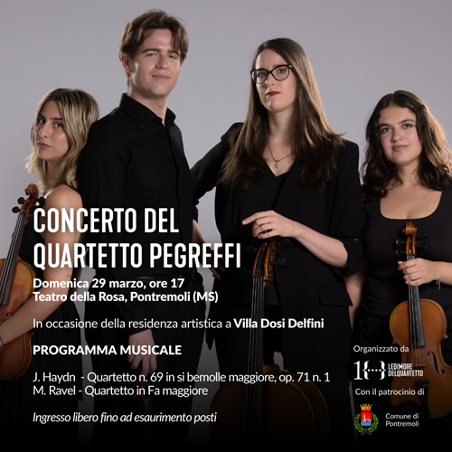Il fascino del Barocco pontremolese e l’energia dei giovani talenti internazionali si incontrano per un pomeriggio musicale di eccezione. Domenica 29 marzo alle ore 17.00, il Teatro della Rosa di Pontremoli ospita il concerto del Quartetto Pegreffi; l’appuntamento rappresenta il culmine di una settimana di studio ospitata a Villa Dosi Delfini, capolavoro del Barocco Pontremolese edificato alla fine del XVII secolo, organizzata dall’impresa culturale creativa Le Dimore del Quartetto.Seguendo il modello di residenza artistica de Le Dimore del Quartetto i musicisti vengono ospitati gratuitamente in una dimora storica per un periodo massimo di una settimana e, in cambio, ringraziano per l’ospitalità restituendo alla dimora la propria musica con un concerto professionale gratuito. Questo sistema di economia circolare trasforma le ville storiche in hub culturali vivi, riportando la musica nei luoghi per cui è stata concepita e avvicinando nuovi pubblici al patrimonio locale.Formato nel 2023, il Quartetto Pegreffi riunisce Emma Parmigiani e Inesa Baltatescu (violini), Emanuele Ruggero (viola) e Lorenza Baldo (violoncello). Tra i più promettenti ensemble emergenti italiani, il gruppo ha già ottenuto importanti riconoscimenti nazionali e internazionali e ha affinato la propria formazione con maestri di fama, partecipando a festival e competizioni in tutta Europa.