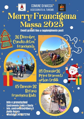 "MERRY FRANCIGENA MASSA 2025" è l'iniziativa di valorizzazione del percorso storico della via Francigena nel territorio massese ideata e promossa dall'Amministrazione comunale attraverso l'assessorato al Turismo e Grandi eventi di Giorgia Garau. L'evento che si rinnova per il terzo anno consecutivo con richieste di partecipazione sempre crescente, propone tre passeggiate culturali-escursionistiche lungo il tratto massese della via Francigena in programma nei giorni 26 dicembre; 3 e 5 gennaio prossimo. L'organizzazione delle escursioni, tutte a partecipazione libera e gratuita, è stata affidata dagli uffici Turismo del Comune, all'associazione Controvento trekk & Storia che si avvale del contributo dell'appassionata di storia locale e guida turistica, Antonella Aurora Manfredi. L'assessore Giorgia Garau dichiara " Sono estremamente orgogliosa di presentare la terza edizione di 'Merry Francigena Massa 2025'/2026 un evento che quest'anno si conferma come uno degli appuntamenti più attesi del nostro calendario natalizio. Quando abbiamo lanciato questo progetto tre anni fa, era una scommessa, un'intuizione audace: unire il fascino della Via Francigena Apuana, il nostro straordinario patrimonio paesaggistico, con lo spirito di festa del periodo natalizio. Oggi, posso dire con grande soddisfazione che quella scommessa è diventata una splendida e amata conferma.