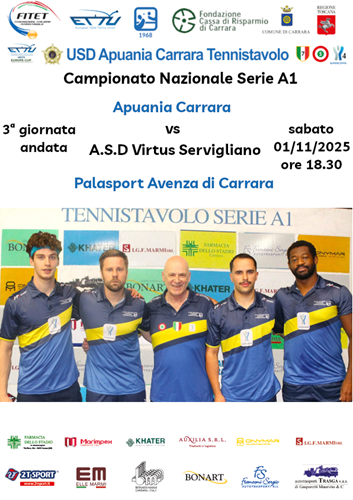 Sabato 1 novembre alle ore 18.30, l’Apuania Carrara Tennistavolo ospiterà il Servigliano per la terza giornata di andata del campionato nazionale Serie A1 di Tennistavolo sotto la direzione di Luca Mariotti. La squadra carrarese è reduce dalla sconfitta casalinga per 3 a 1 contro la Bagnolese a causa delle non buone prestazioni dei due stranieri Ibrahima Diaw e Jon Persson. L’incontro si presenta molto difficile perché il Servigliano è ancora a zero punti e pertanto giocherà alla morte per cercare di invertire l’andamento iniziale del suo campionato, dal lato apuano dopo la battuta di arresto di sabato ci giocherà al cento per cento per ritornare alla vittoria.La squadra apuana sarà al meglio potendo contare sull’organico al completo e il team marchigiano potrà contare su Enzo Anglais, Giacomo Izzo, Mathieu De Saintilan e Daniele Pinto. "Mi aspetto una pronta reazione dopo la sconfitta di sabato - ha detto il presidente Guglielmo Bellotti - la squadra marchigiana è ultima a zero punti ma non merita la posizione che occupa in classifica, per parte nostra stiamo preparando al meglio l’incontro, molto dipenderà da come i singoli giocatori si esprimeranno sul campo”